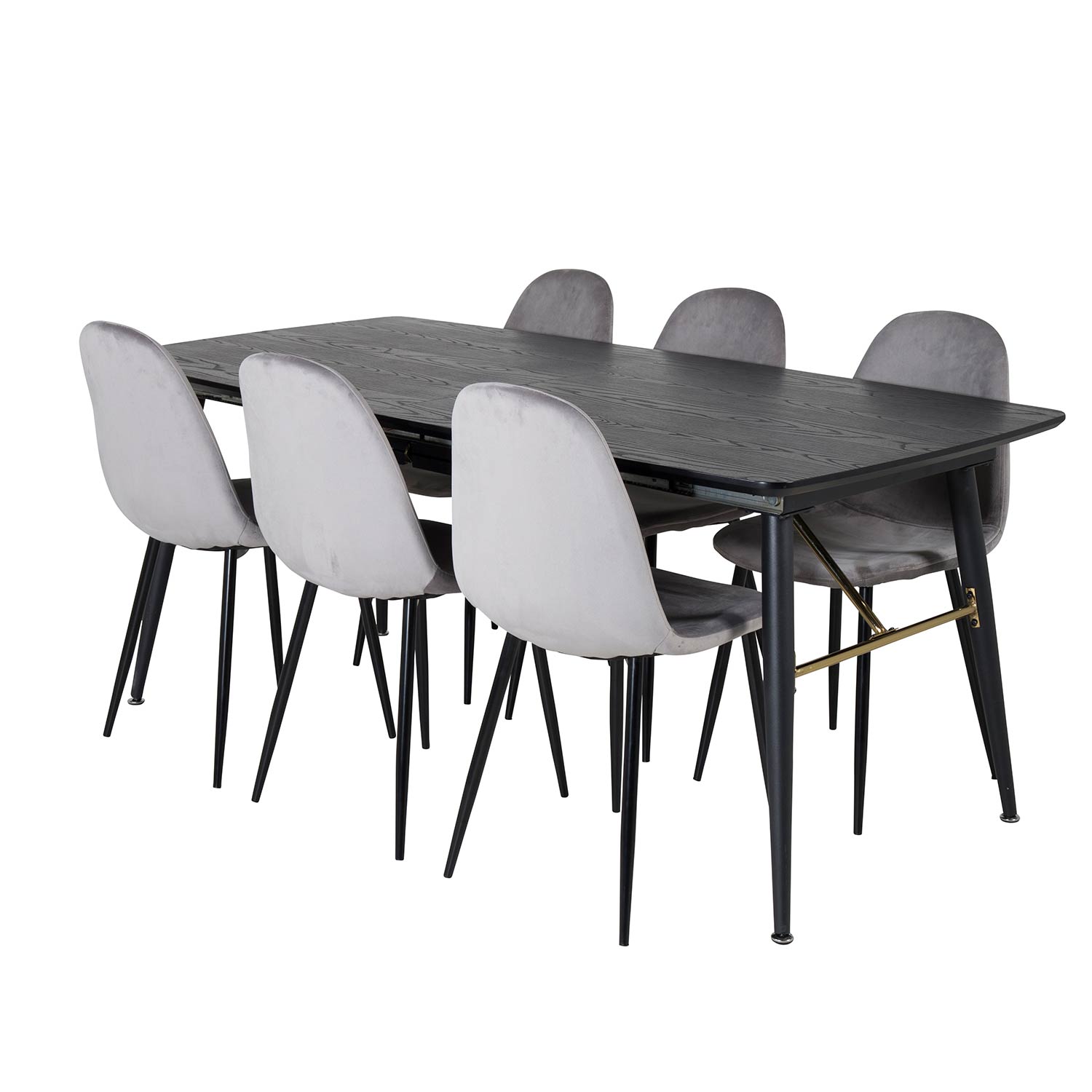Matgrupp Dipp med 6 Polar Stolar Sammet från Venture Home är en stilren matgrupp med ett förlängningsbart matbord i svart MDF och svarta bordsben i metall. Det medföljer sex matstolar med stolsben i metall och sitsar i sammet.