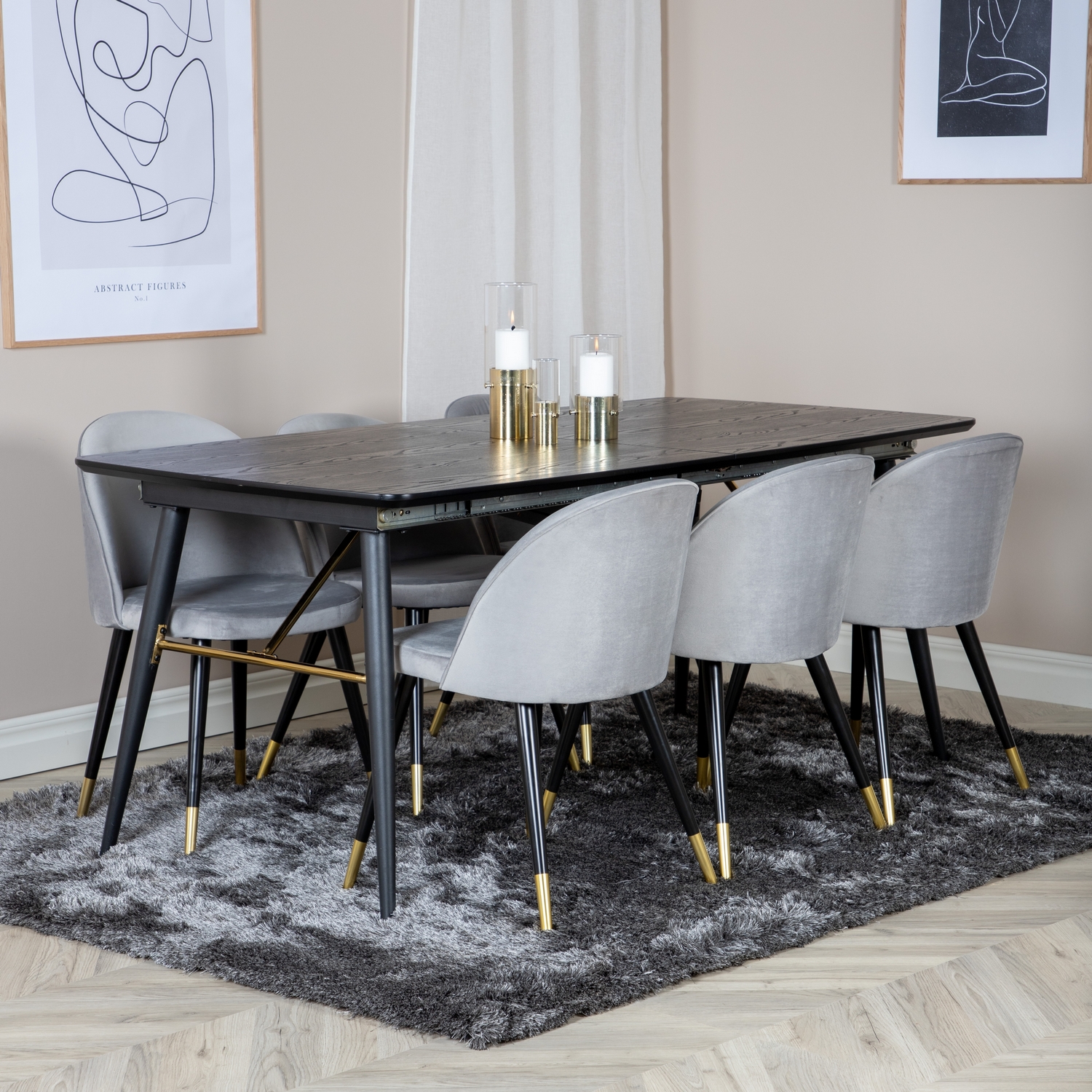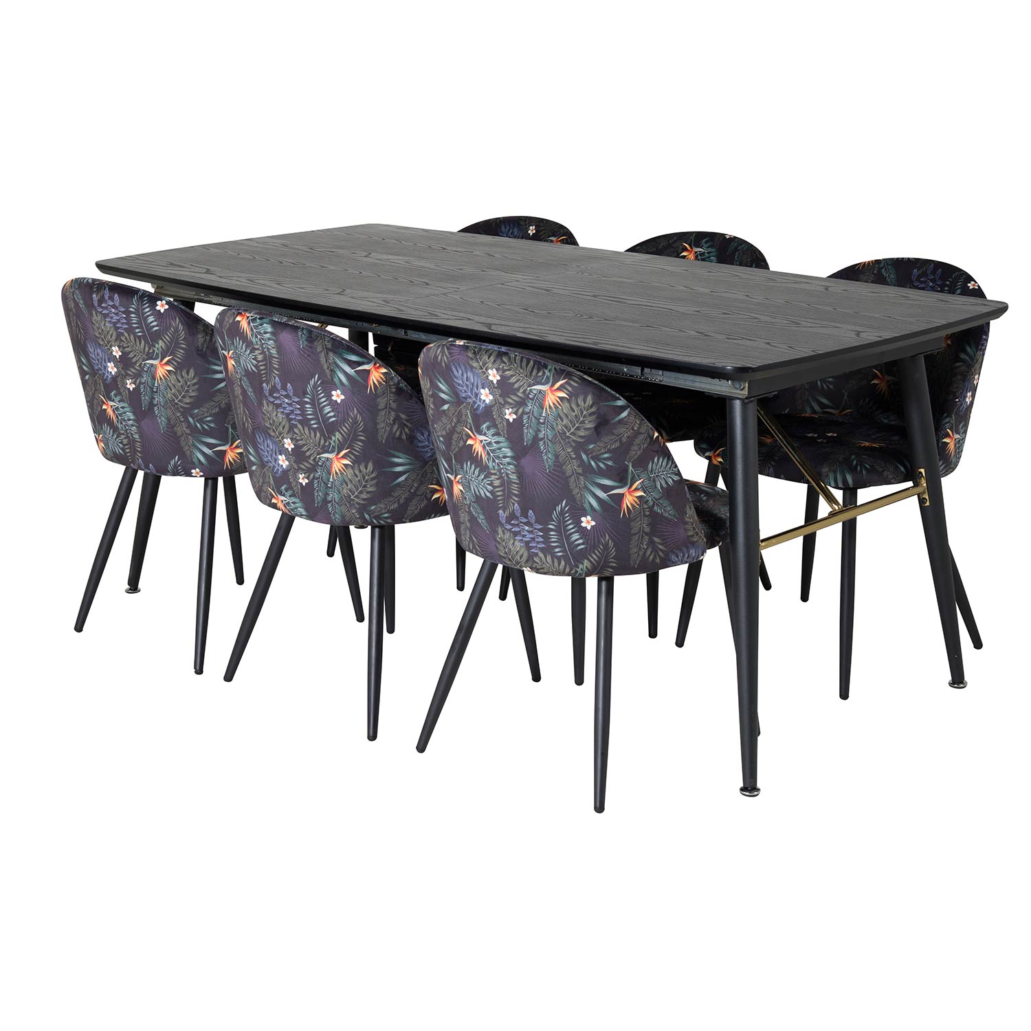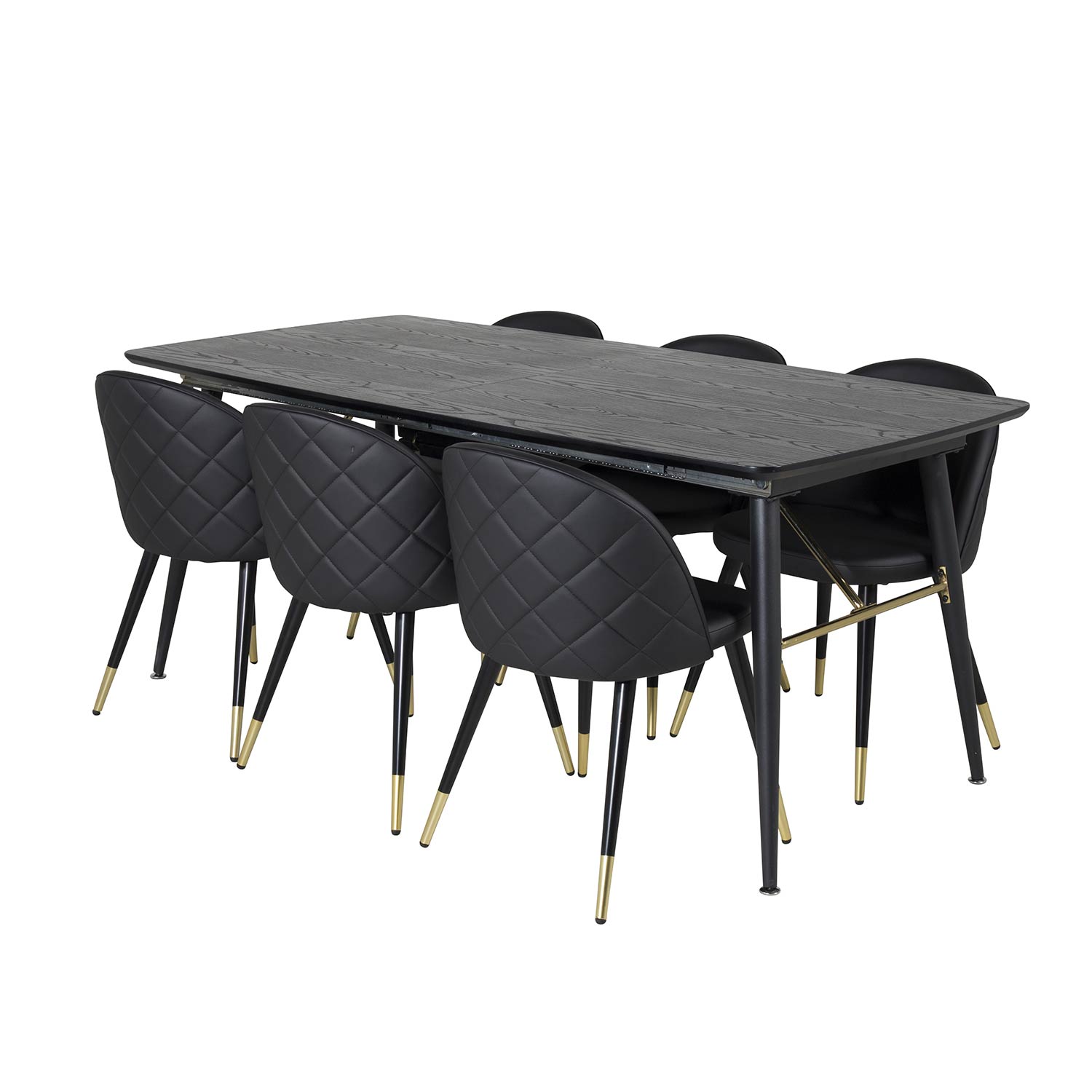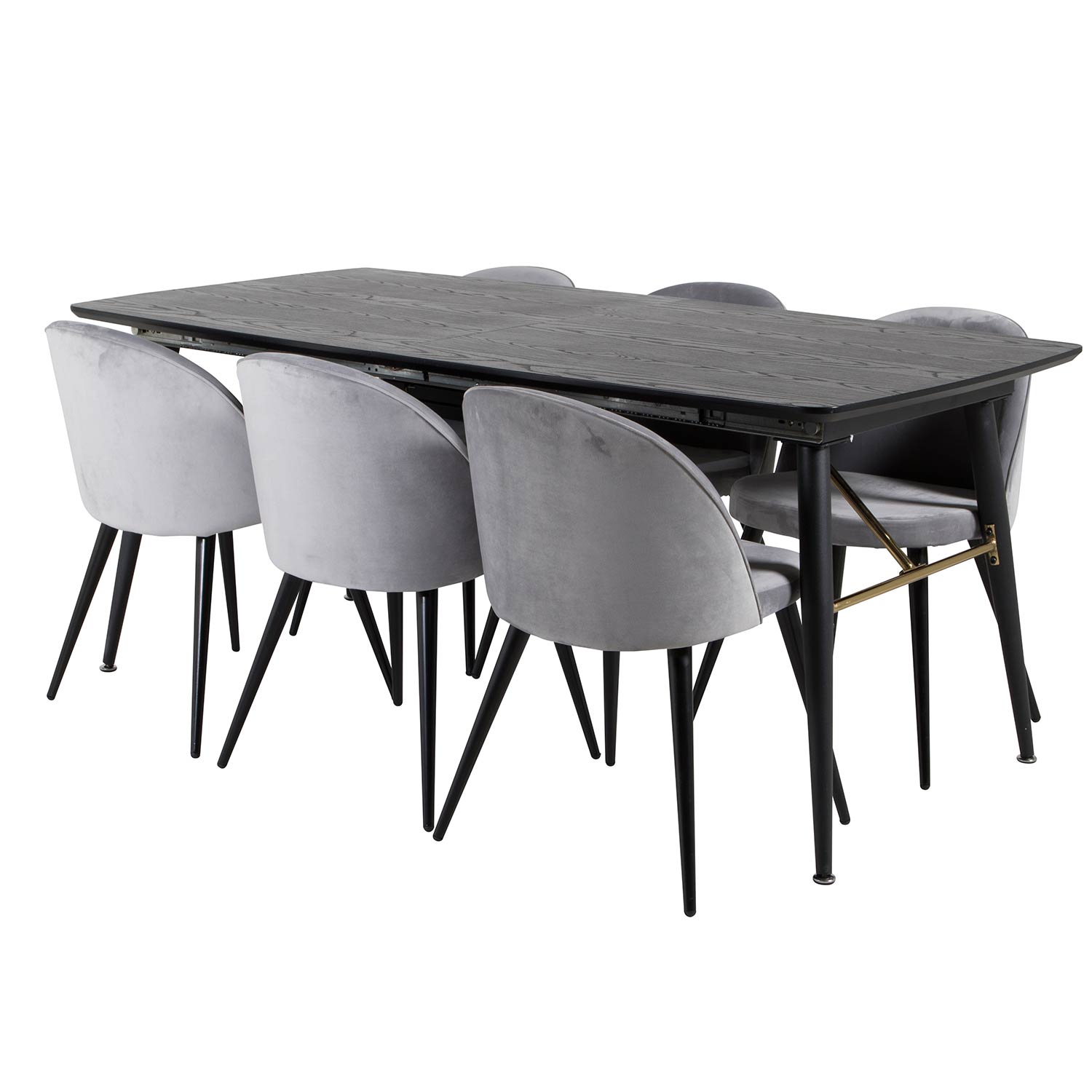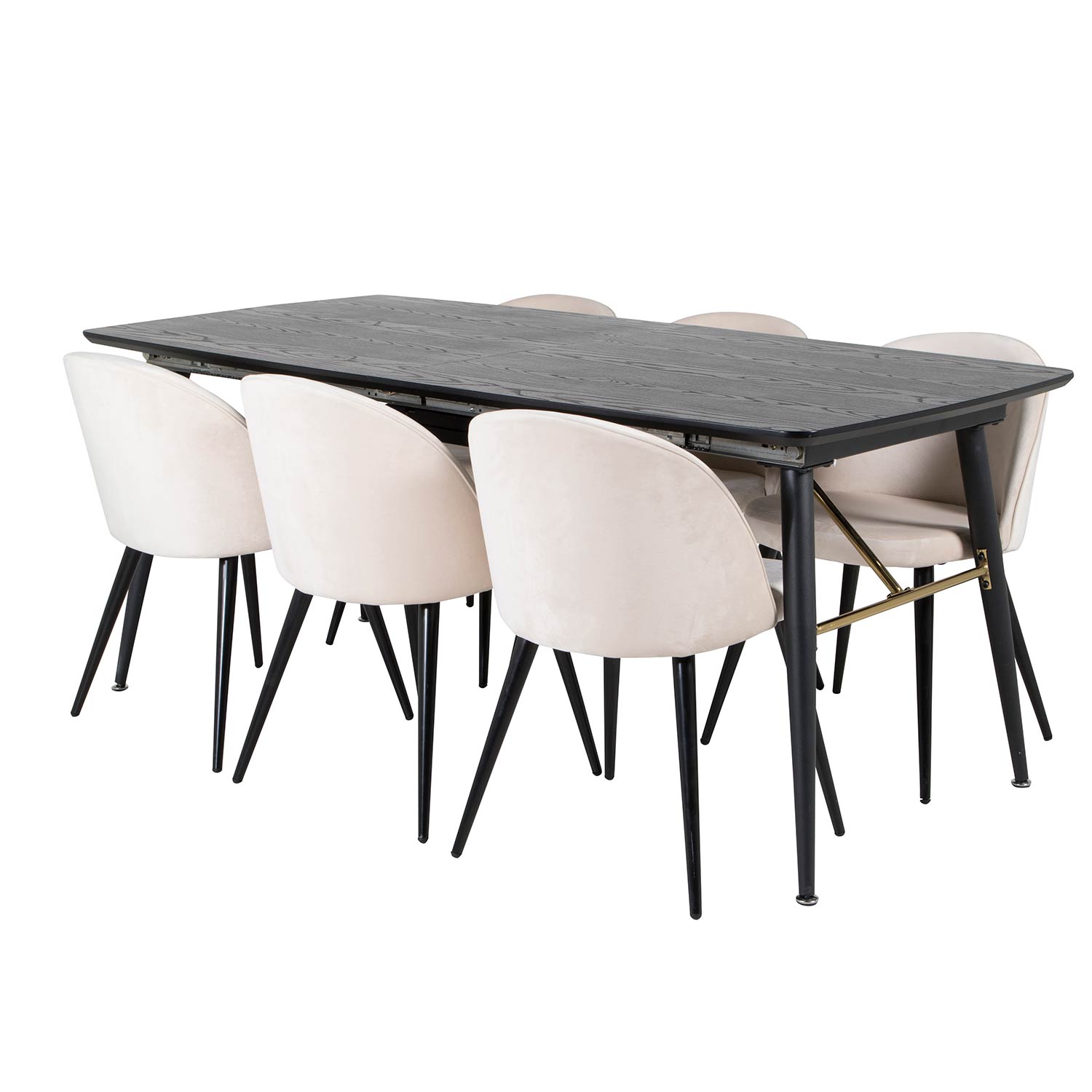 Matgrupp Venture Home Guld med 6 Velvet Stolar Sammet är en elegant matgrupp med ett förlängningsbart matbord i svart MDF och svarta bordsben i metall. Det medföljer sex matstolar med svarta stolsben i metall och sitsar i sammet.