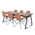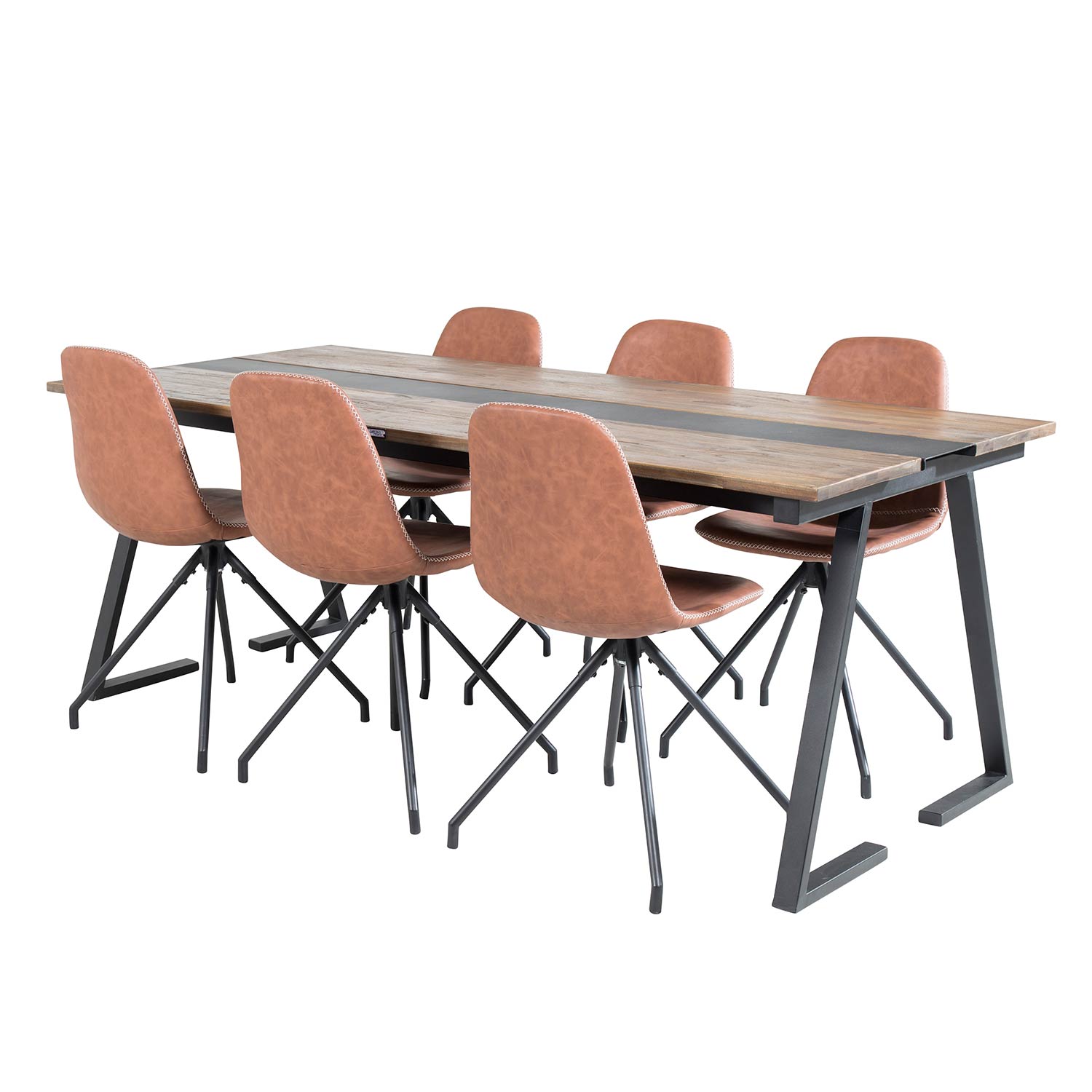 Matgrupp Jane med 6 Pobbie Snurrfunktion Stolar Konstläder från Venture Home är en modern matgrupp med ett rektangulärt matbord i industriell design med en stomme och ben i svart pulverlackerad metall med en bordsskiva av mörk teak och svart pulverlackerad metall. Det medföljer sex matstolar i en helklädd design med snurrfunktion, stomme och ben i svart pulverlackerad metall med en lätt rundad rygg och sits i stoppat konstläder med vacker dekorsöm. Lättare montering krävs.