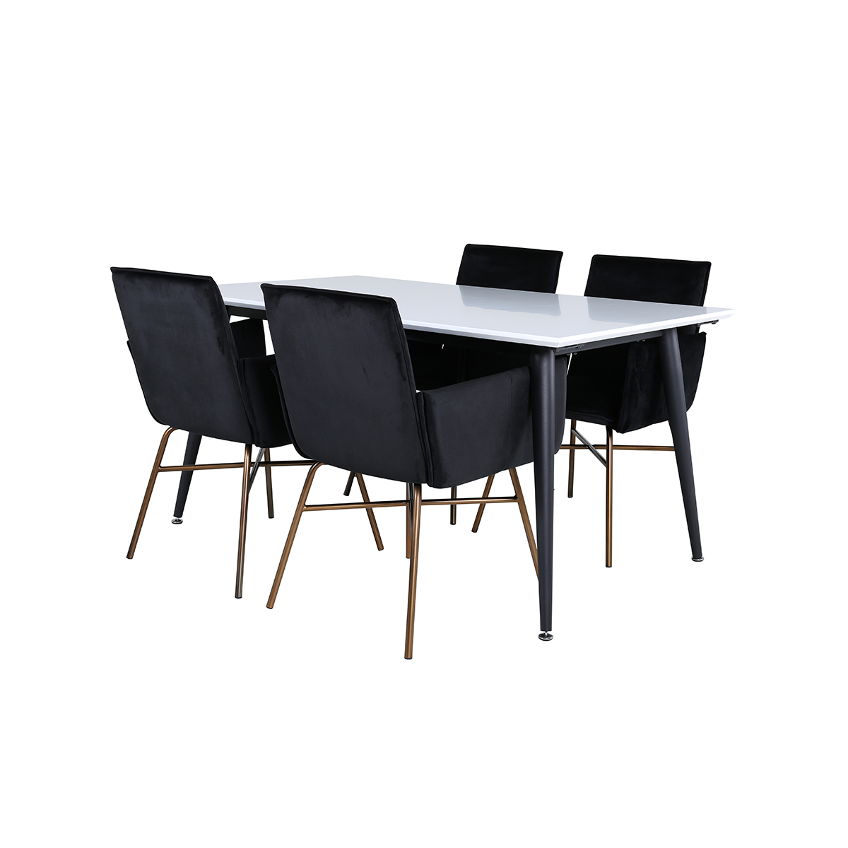 Matgrupp Venture Home Jolie med 4 Annika Stolar har ett förlängningsbart matbord i HPL och MDF med bordsben i järn. Det ingår 4 st Annika matstolar med stolsben i järn och sitsar i sammet.