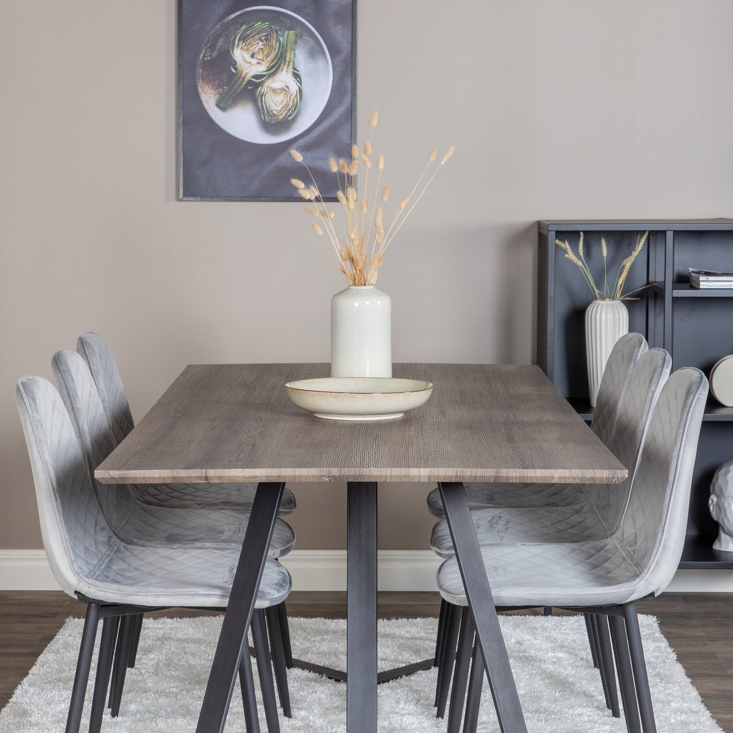 Matgrupp Madde med 6 Phoi Stolar Sammet från Venture Home är en modern matgrupp med ett matbord i MDF med svarta bordsben i metall. Det medföljer sex matstolar med svarta stolsben i metall och sitsar i sammet.