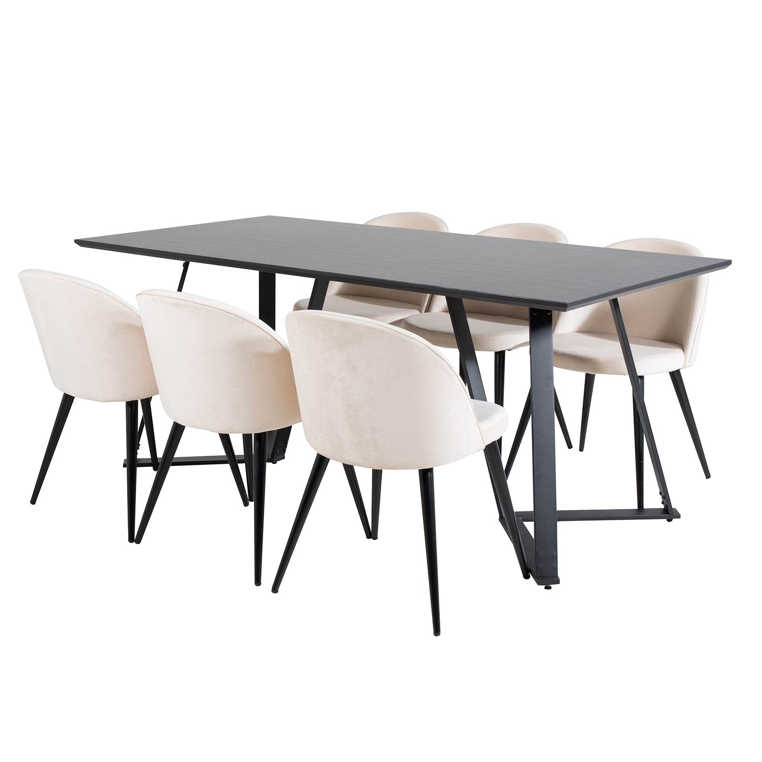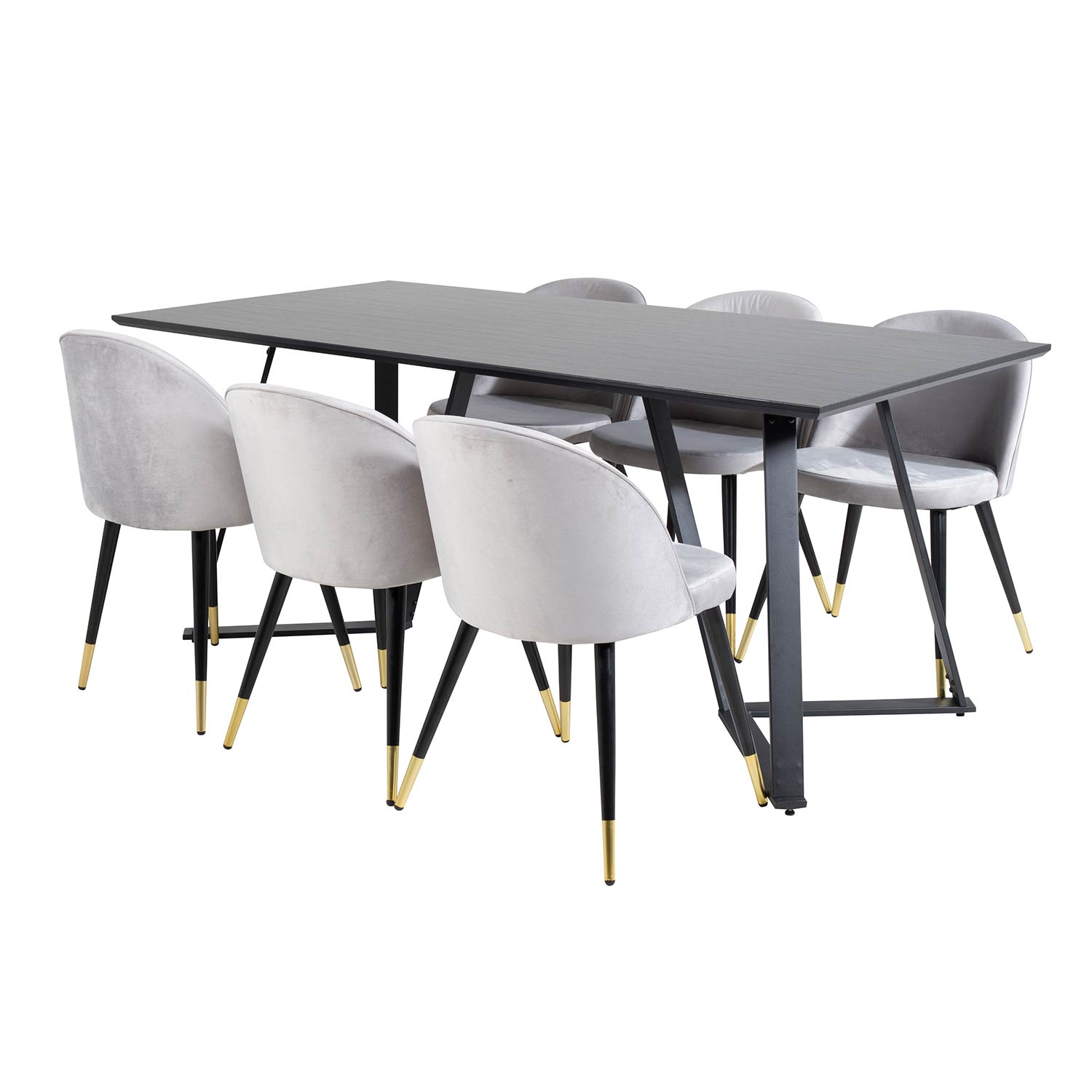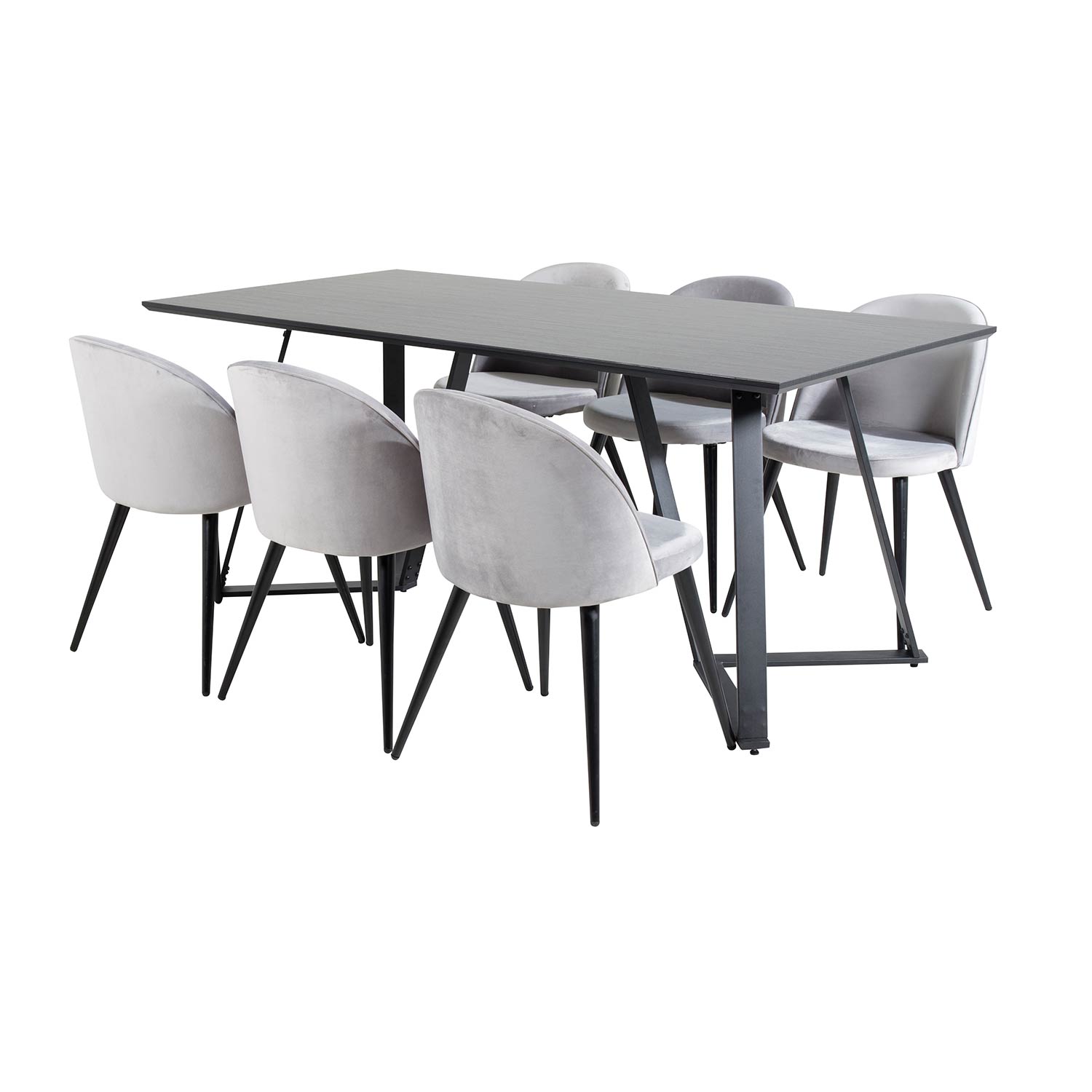 Matgrupp Madde med 6 Valentina Stolar Sammmet från Venture Home är en modern matgrupp med ett matbord i MDF med svarta bordsben i metall. Det medföljer sex matstolar med svarta stolsben i metall och sitsar i sammet.