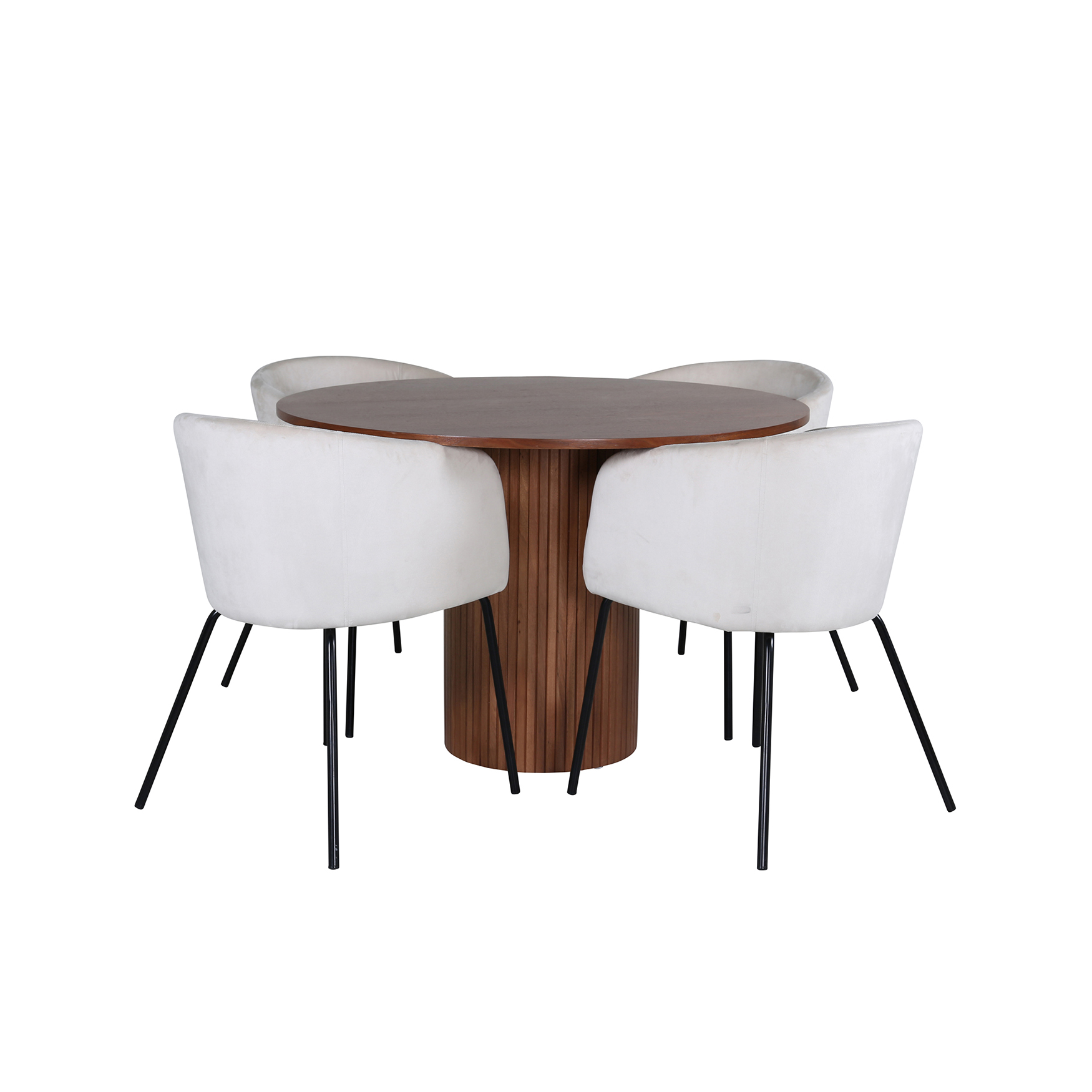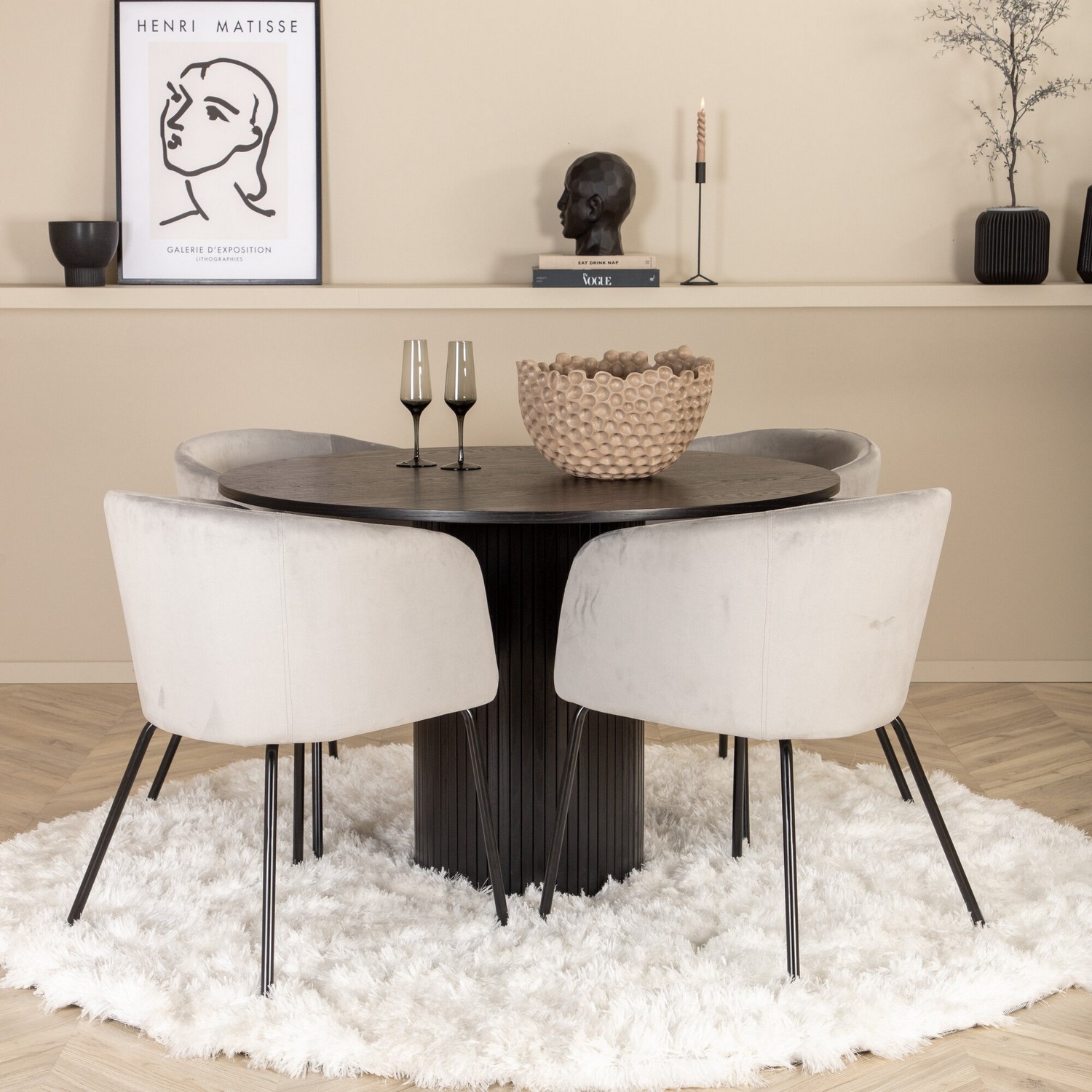 Matgrupp Bianca, med ett runt matbord i MDF med faner med bordsben i trä och MDF. Matchas med 4 st Bergen matstolar med sitsar i sammet.