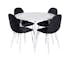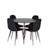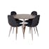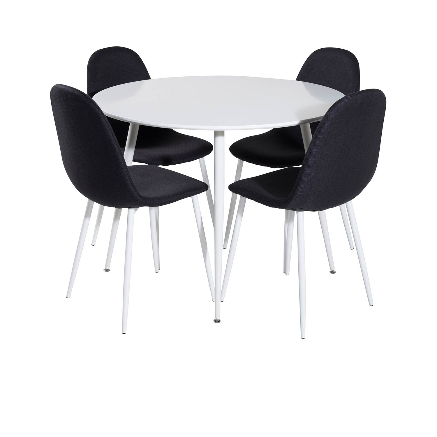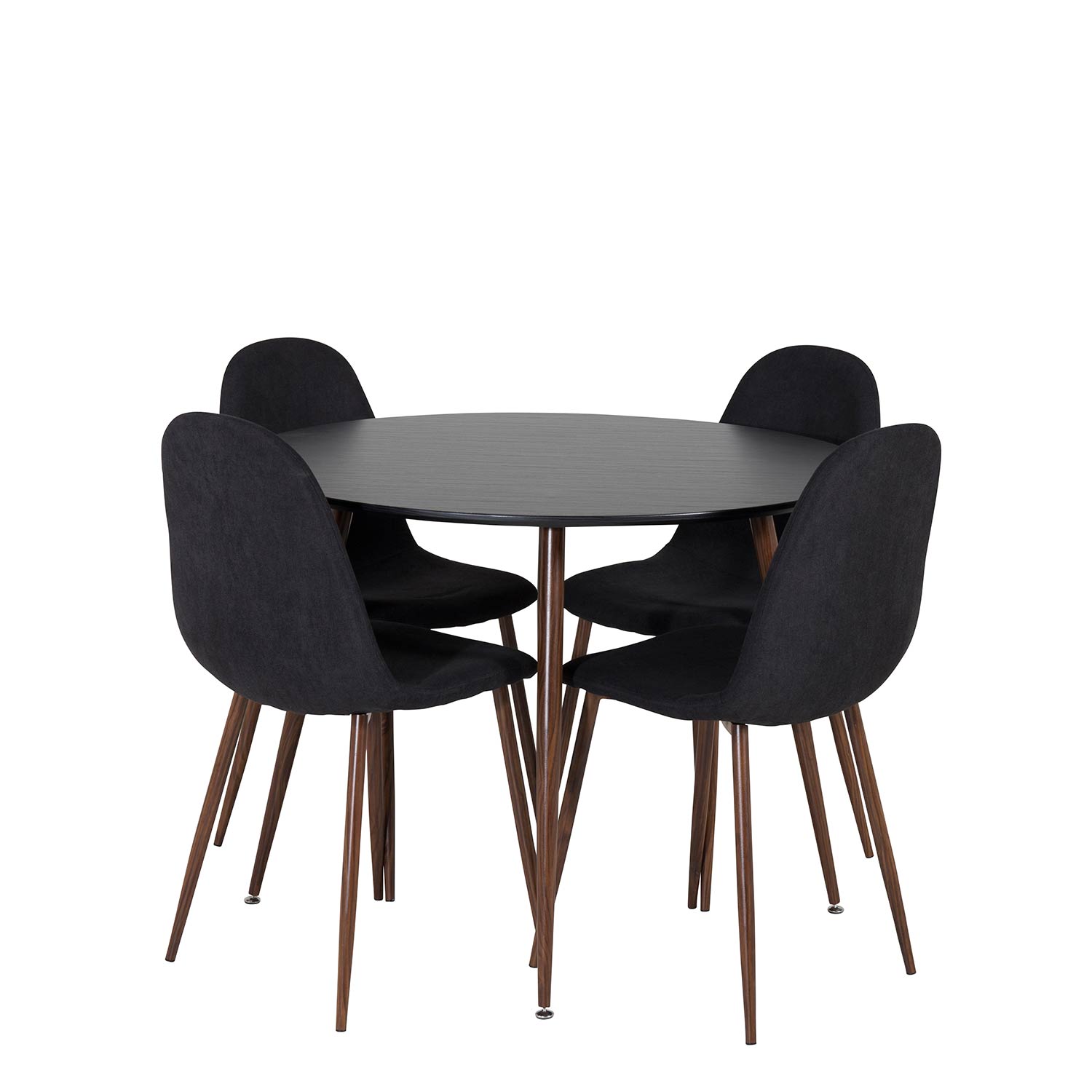 Matgrupp Plake med 4 Pobbie Stolar Polyestertyg Runt från Venture Home är en stilren matgrupp med ett runt matbord med ben i metall och en bordsskiva av MDF. Det medföljer fyra matstolar med stolsben i metall och sitsar i polyester.