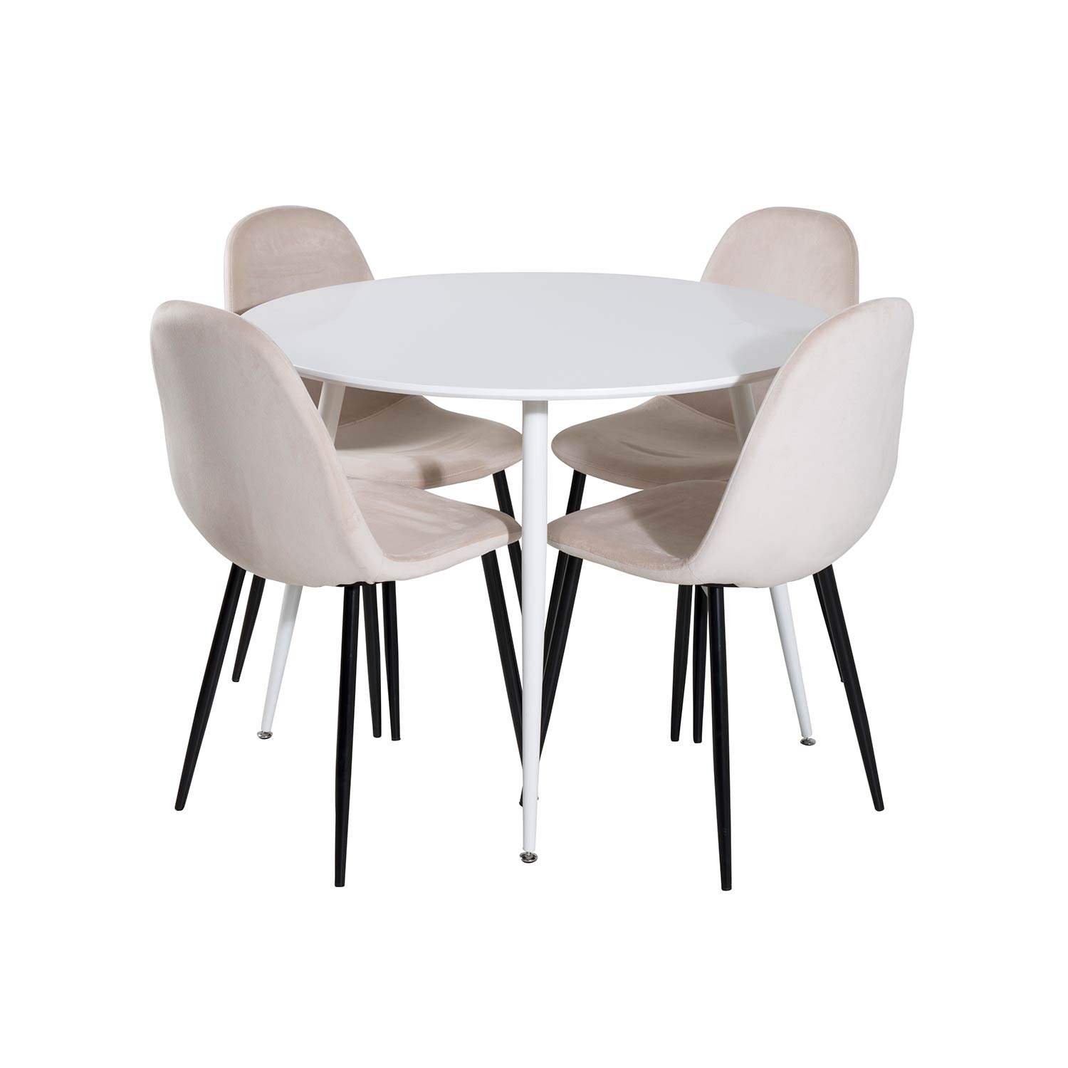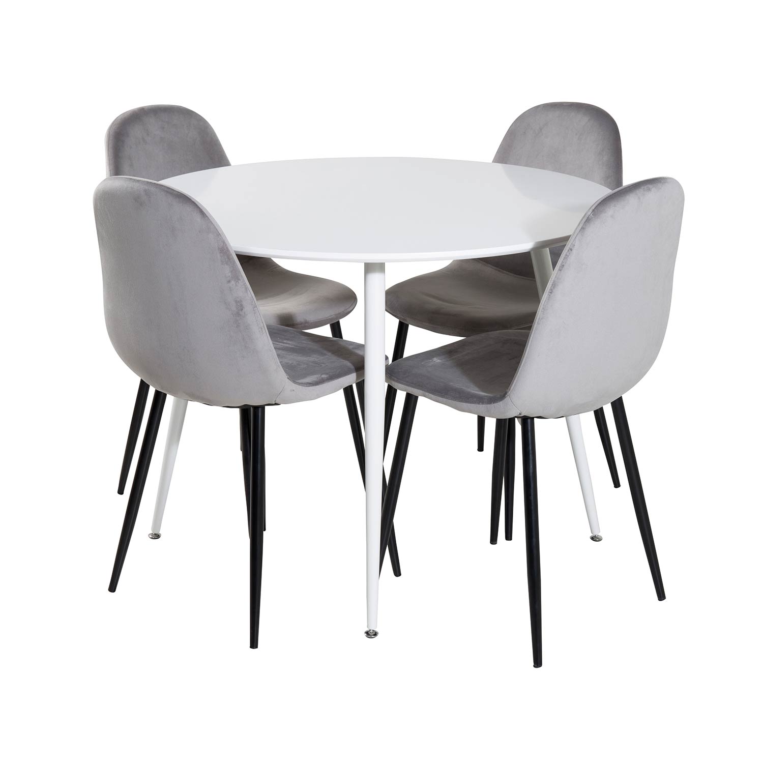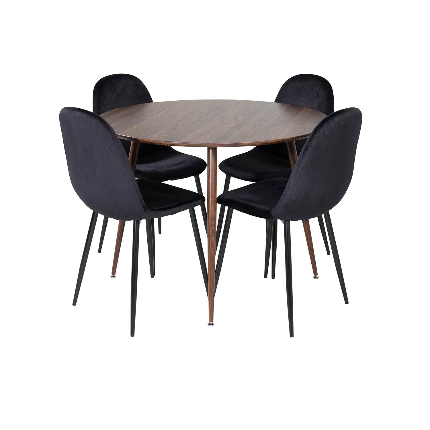 Matgrupp Plake med 4 Pobbie Stolar från Venture Home är en stilren matgrupp med ett vackert runt bord och fyra stolar i bekväm sammet.