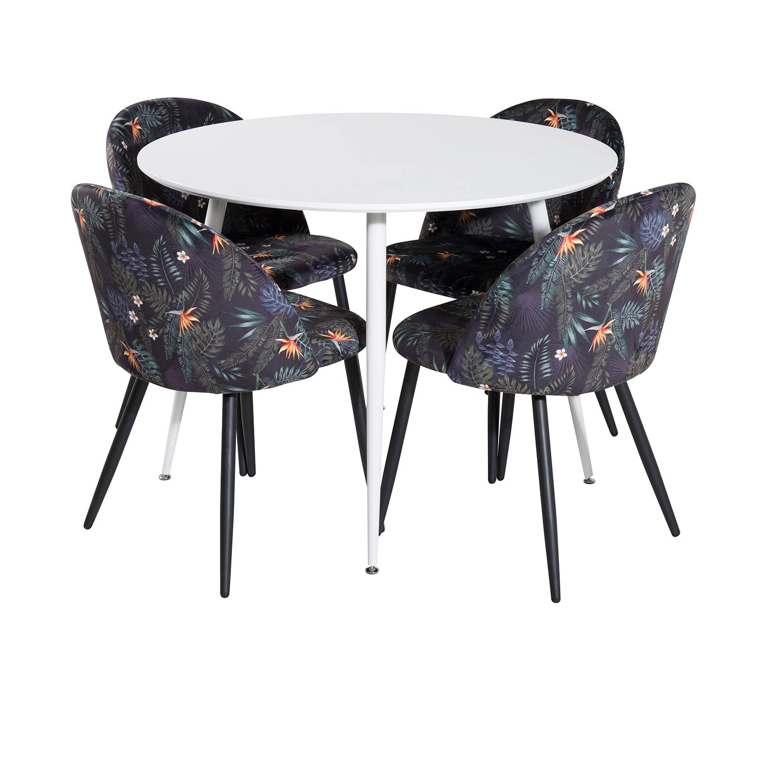Matgrupp Plake med 4 Valentina Stolar Polyestertyg Runt från Venture Home är en elegant matgrupp med ett runt matbord med ben i metall och en bordsskiva av MDF. Det medföljer fyra matstolar med stolsben i metall och sitsar i polyester.