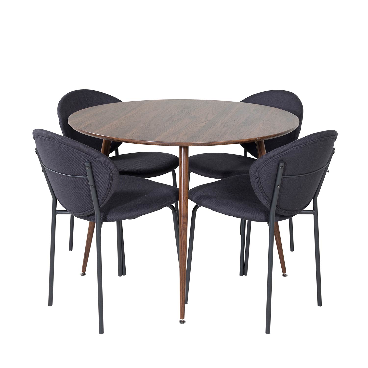Matgrupp Plake med 4 Valor Stolar Runt från Venture Home är en stilren matgrupp med ett runt matbord med ben i metall och en bordsskiva av MDF. Det medföljer fyra matstolar med en stomme och ben i svart pulverlackerad metall, i en snygg design med rund rygg. Stolarna har en rygg och sits i stoppat polyestertyg. Lättare montering krävs.