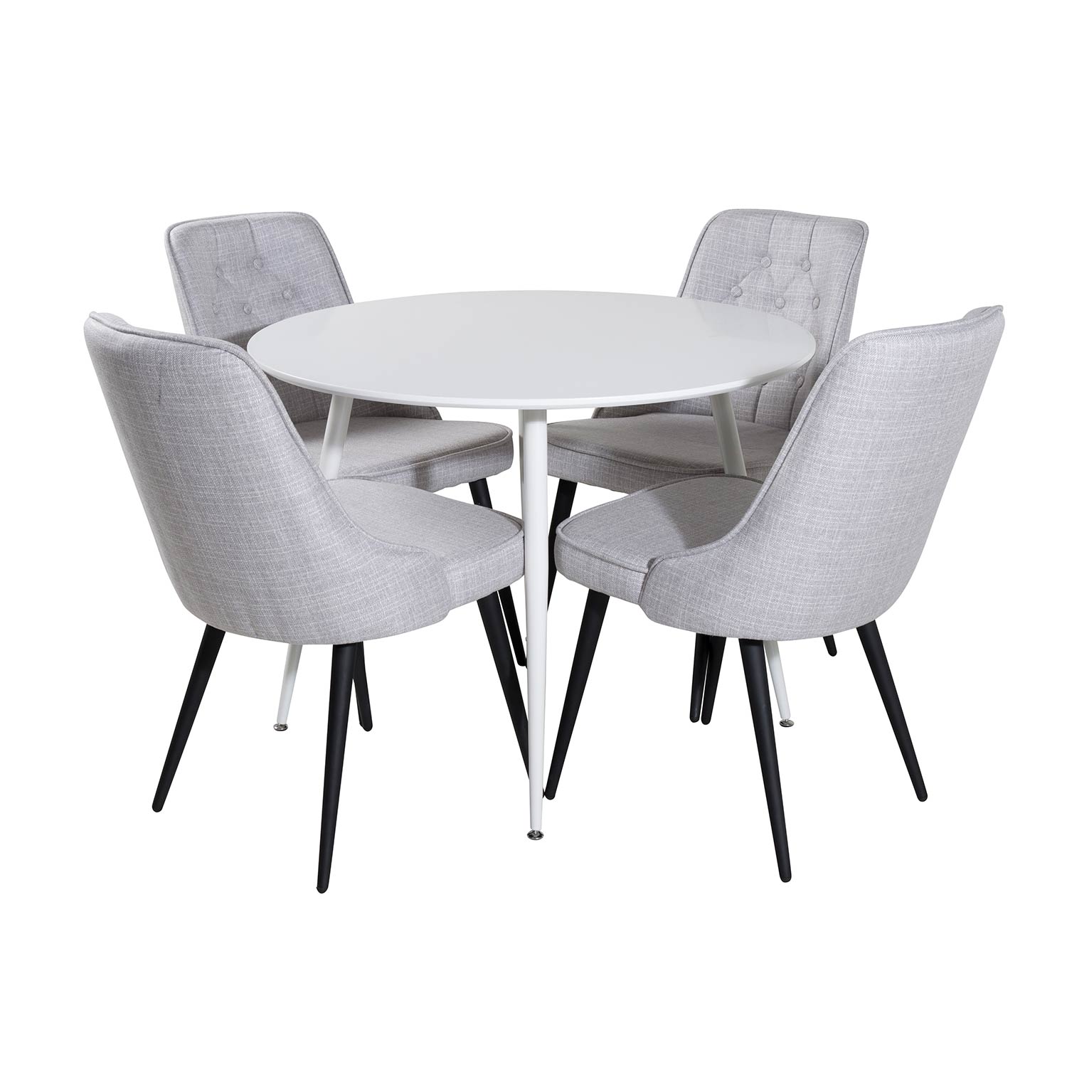 Matgrupp Plake med 4 Vera Stolar Polyestertyg Runt från Venture Home är en stilren matgrupp med ett runt matbord med ben i metall och en bordsskiva av MDF. Det medföljer fyra matstolar med stolsben i metall och sitsar i polyester.