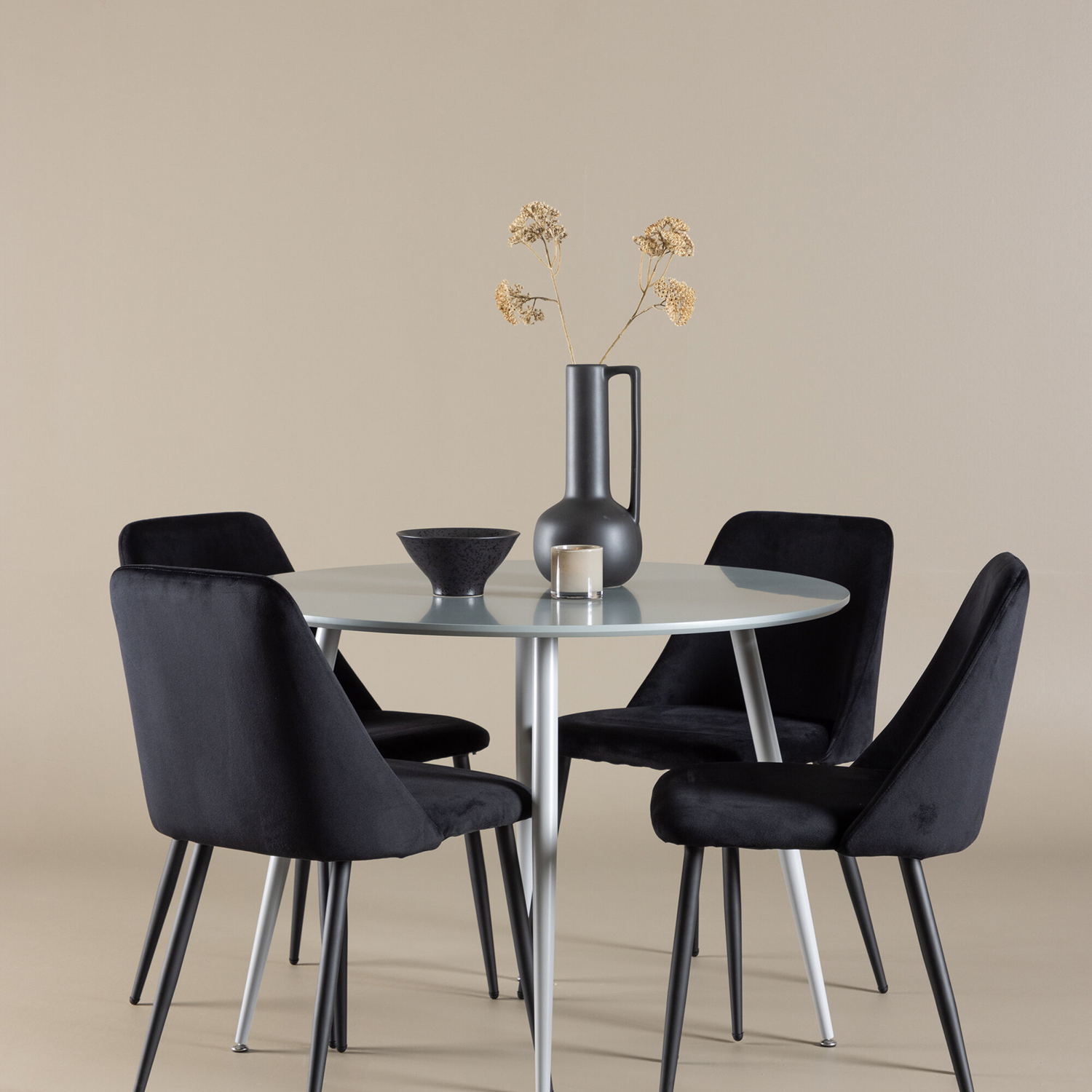De fyra medföljande Night-stolarna kompletterar bordet perfekt med sin eleganta design och höga komfort. Stolarna är klädda i svart sammet, vilket ger en mjuk och inbjudande sittupplevelse. Sammetstyget är känt för sin elegans och bekvämlighet, vilket gör att du och dina gäster kan sitta bekvämt under långa måltider och trevliga samtal. De svarta stolarna skapar en stilfull kontrast mot det grå bordet, vilket ger ditt matrum en modern och sofistikerad atmosfär.