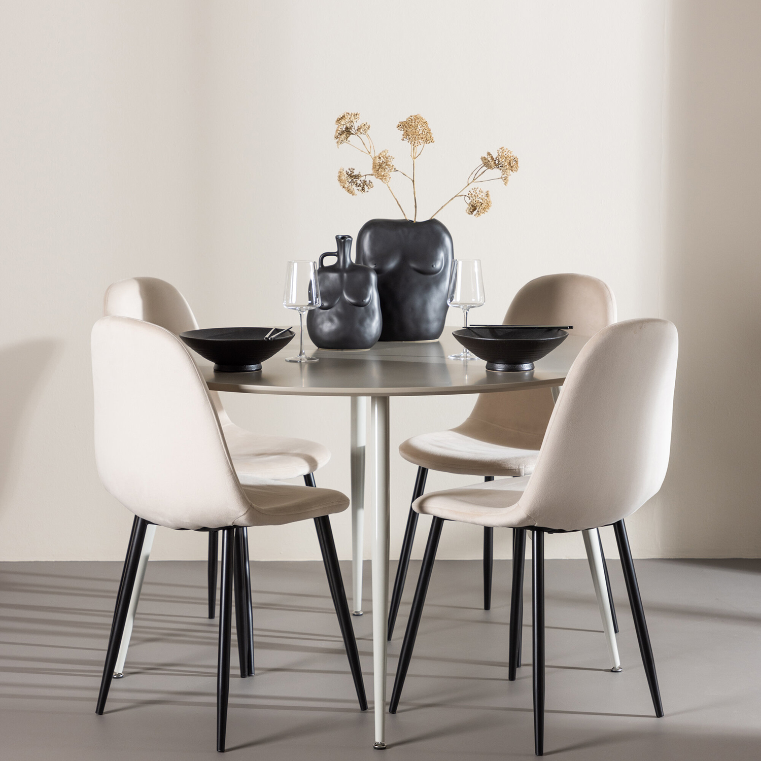 De fyra Polar-stolarna kompletterar bordet perfekt med sina eleganta sitsar klädda i sammet. Dessa stolar erbjuder både komfort och stil, vilket gör dem idealiska för långa, njutbara middagar med familj och vänner. Deras moderna design med hög ryggstöd och mjuka sitsar ger ditt matrum en sofistikerad och samtida touch.