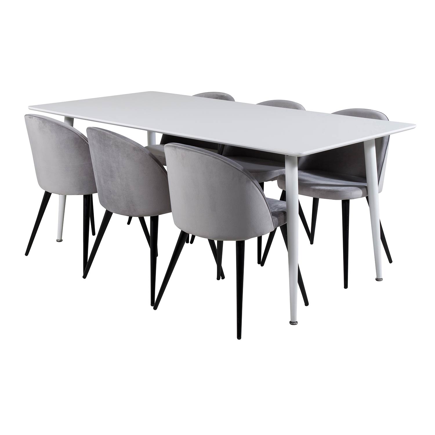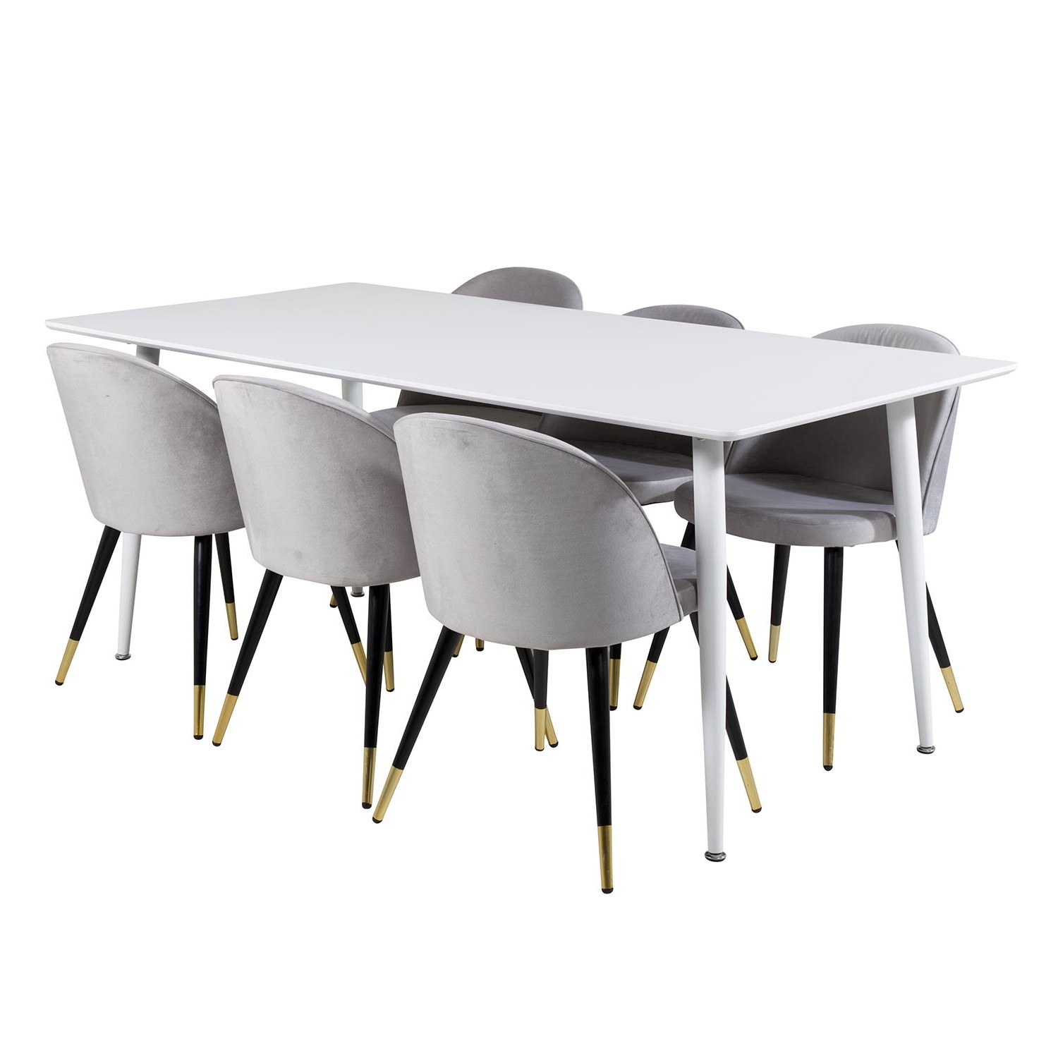 Matgrupp Pobbie med 6 Valentina Stolar Sammet från Venture Home är en elegant matgrupp med ett rektangulärt matbord med ben i metall med en bordsskiva i MDF. Det medföljer sex matstolar med svarta stolsben i metall och sitsar i sammet.