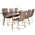 Matgrupp Pobbie från Venture Home. Matbord i MDF med bordsben i metall med ekfolering. Matchas med 6 st gråa Xtra matstolar med stolsits i polyester och naturfärgade stolsben i metall.