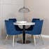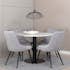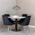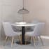 Inred hemmets hjärta med matstolar i serien Velvet Lyx för ett mer elegant blickfång i vardagsrummet! Stolen har en helklädd design i smäckert grått sammetstyg med knappar och dekorsöm i ryggen som blir till en snygg detalj. Ben i mässingsfolierad metall och mjuk stoppning i rygg och sits för extra komfort. Här matchas Stolarna runt vårt matbord Razzia. Bordsskivan är i vacker terazzo med vit finish och stommen är cylinderformad i svart metall.