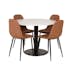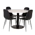 Matgrupp Venture Home Roxanna är en elegant matgrupp med ett runt matbord i vit terazzo bordsskiva och svart underrede i metall tillsammans med fyra stycken Pobbie matstolar i konstgjort läder och stolsben i svart metall.