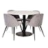Matgrupp Venture Home Roxanna är en elegant matgrupp med ett runt matbord i vit terazzo bordsskiva och svart underrede i metall tillsammans med fyra stycken Valentina matstolar i sammet.