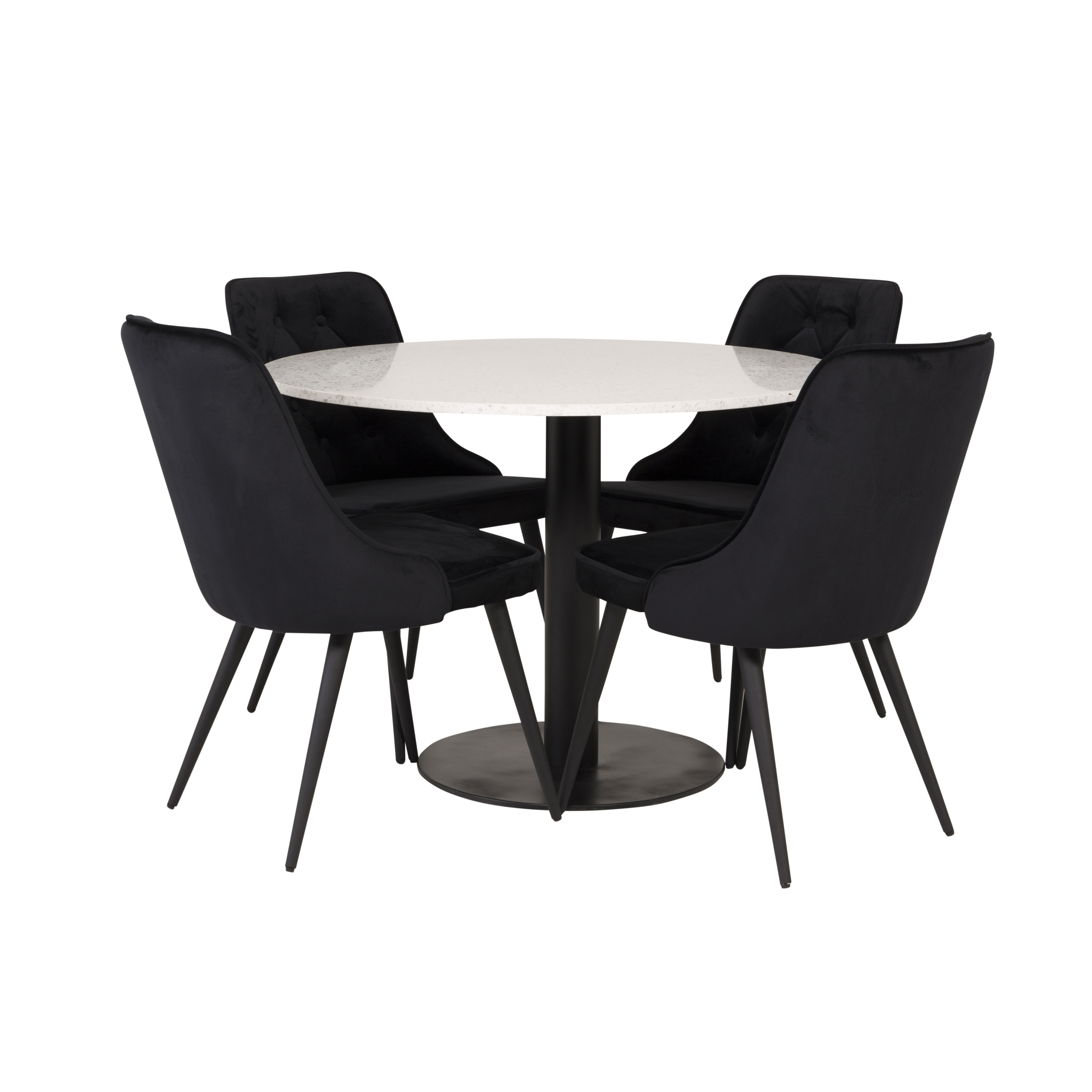 Matgrupp Venture Home Roxanna är en elegant matgrupp med ett runt matbord i vit terazzo bordsskiva och svart underrede i metall tillsammans med fyra stycken Vera matstolar i sammet.