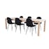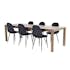 Matgrupp Shy, med ett förlängningsbart matbord och bordsben i ek. Matchas med 6 st Pobbie matstolar med svarta stolsben i metall och sitsar i sammet.