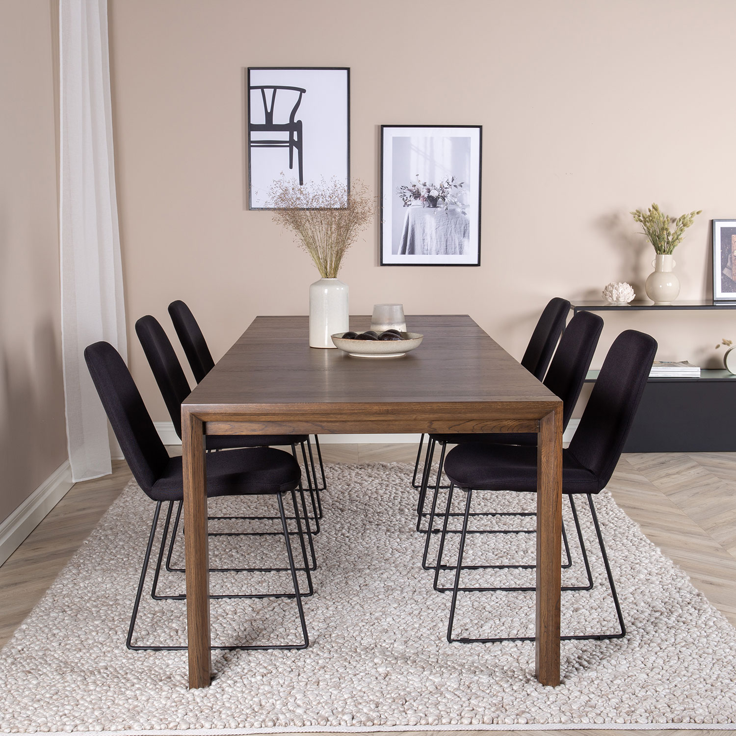 Matbord Slider gör garanterat succé likväl i vardagen som på festmiddagar! Den raka nordiska designen skapar ett modernt blickfång i ditt hem och bordet är förlängningsbart vid behov. Här i perfekt kombination med matstolar från serien Muce. Stolen har en stilren, helklädd, minimalistisk design i svart kulör. Den smala benställning är i svart pulverlackerad metall. Rygg och sits är i svart polyestertyg med mjuk stoppning för extra komfort.