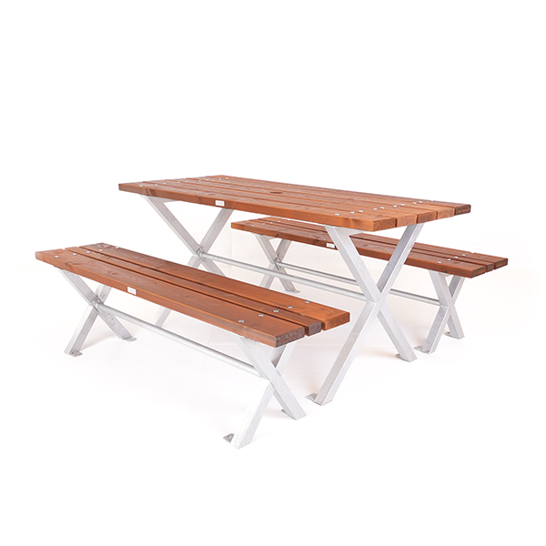Tillverkat i stål, och bord och bänkar i svensk kärnfuru från Norrland, FSC ®-märkt.