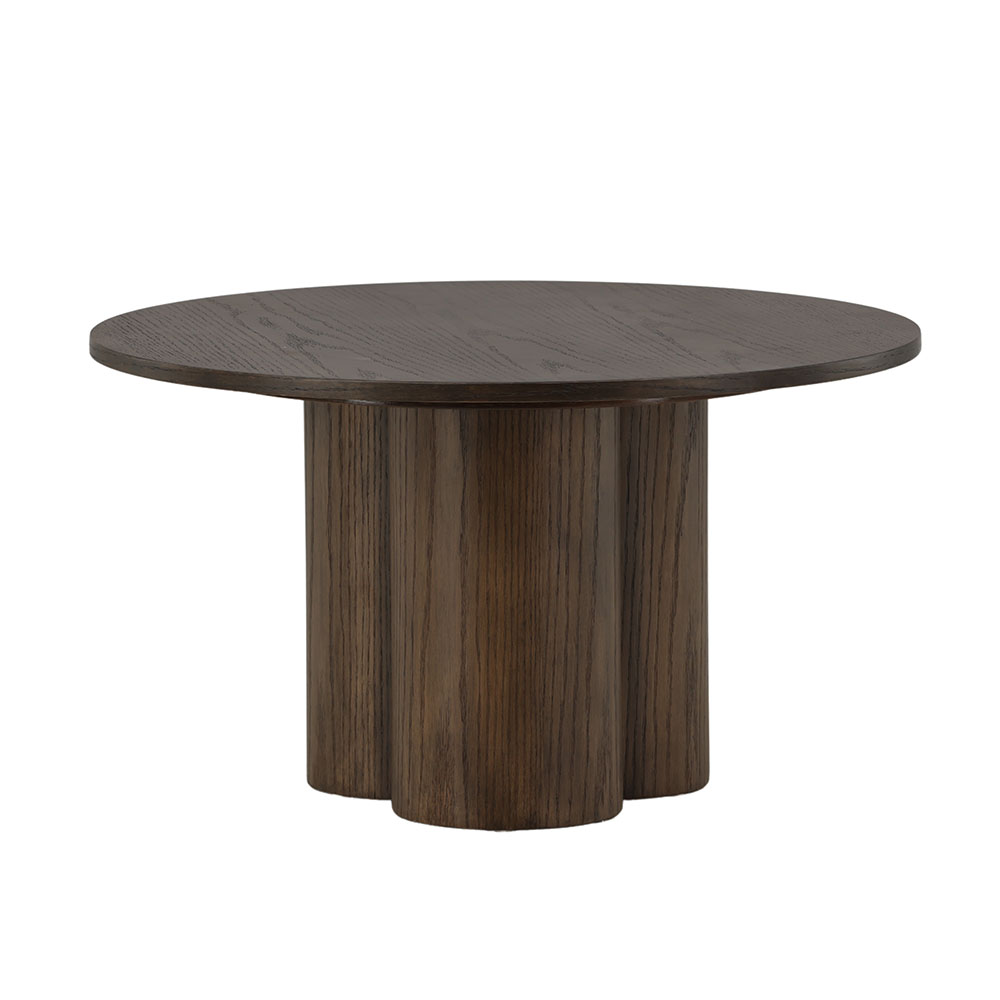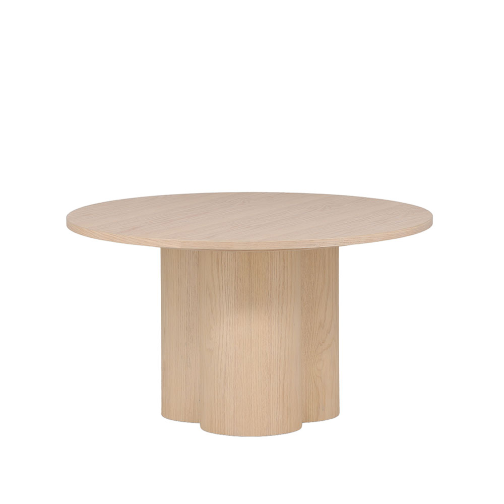 Den runda toppskivan är fanerad och stommen utgörs av tre cylinderformade ben, samlade under bordets mitt.