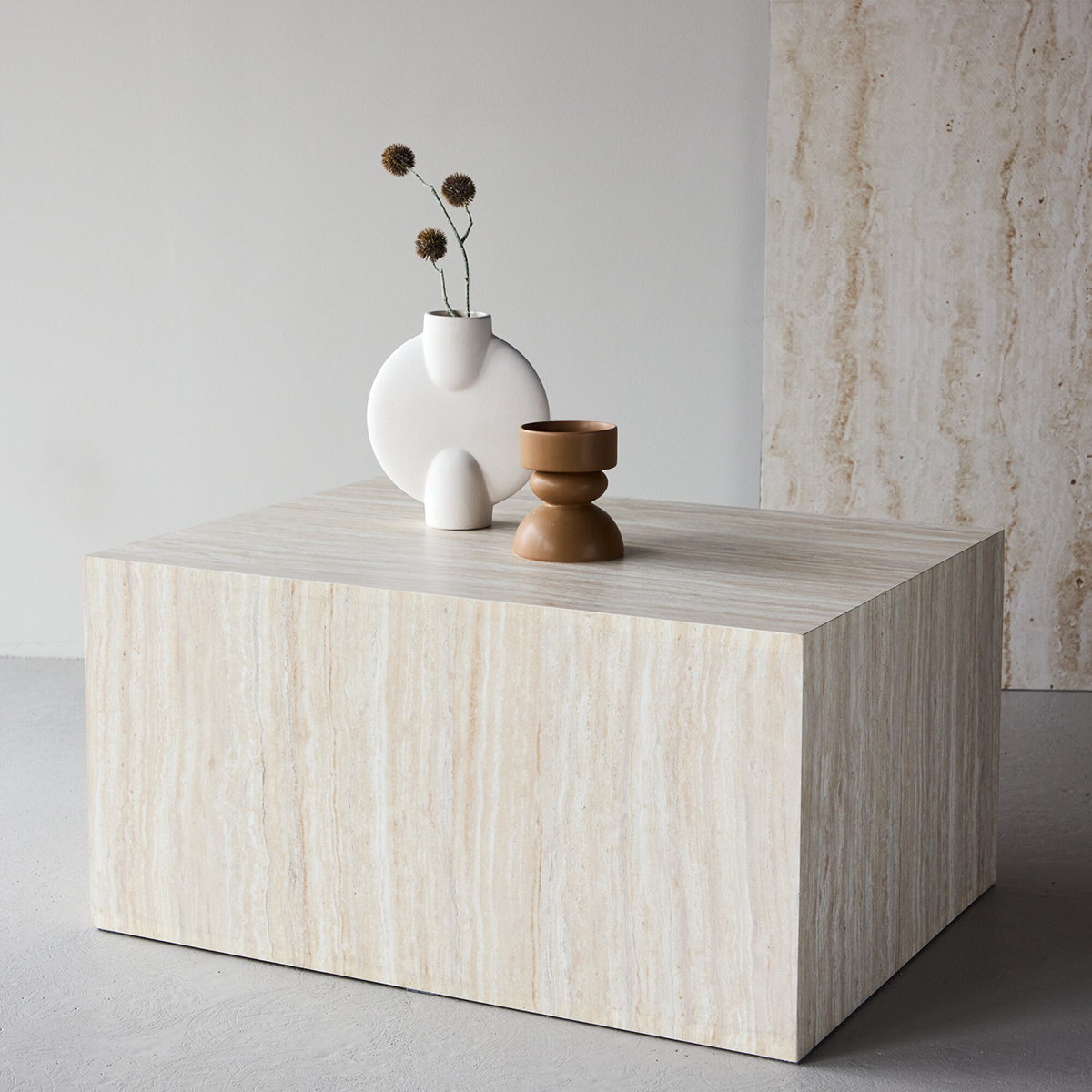 Bordet är blockformat i smakfull beige kulör och tillverkat i MDF med spräckligt marmormönster som ger ett läckert liv till helhetsintrycket.