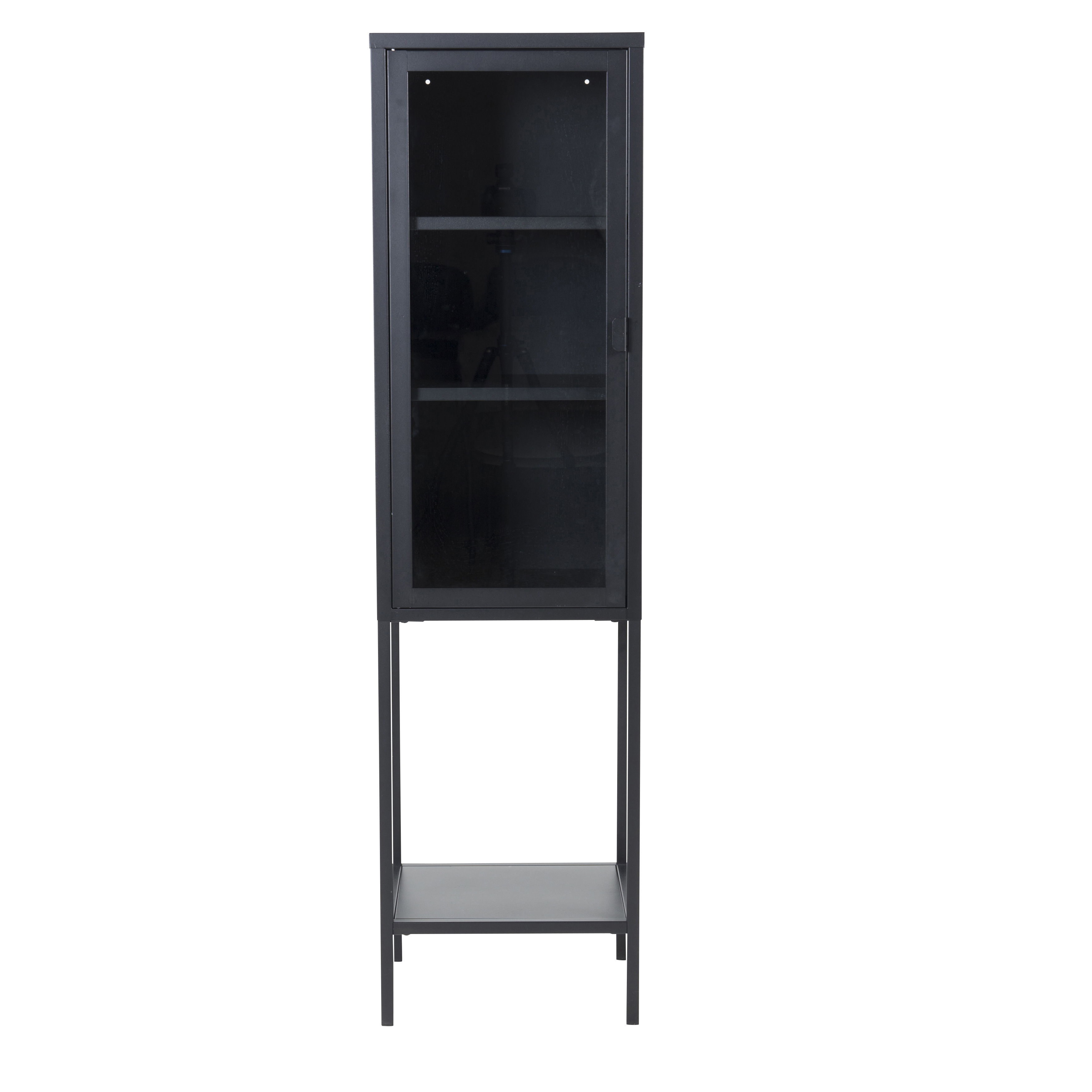 Misha från Venture Home är ett hög och brett vitrinskåp med två hyllplan inne i skåpet, två glasdörrar samt ett öppet hyllplan nedtill. Skåpet är av pulverlackerat stål.