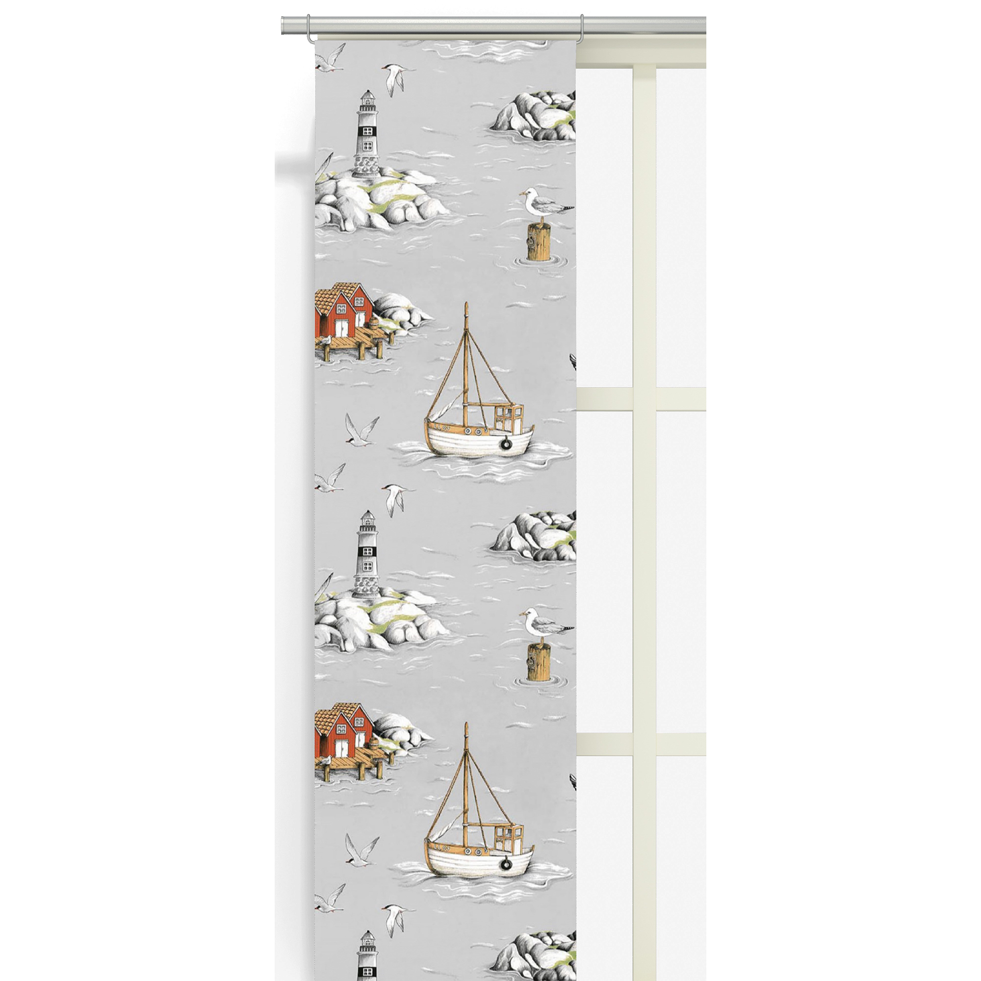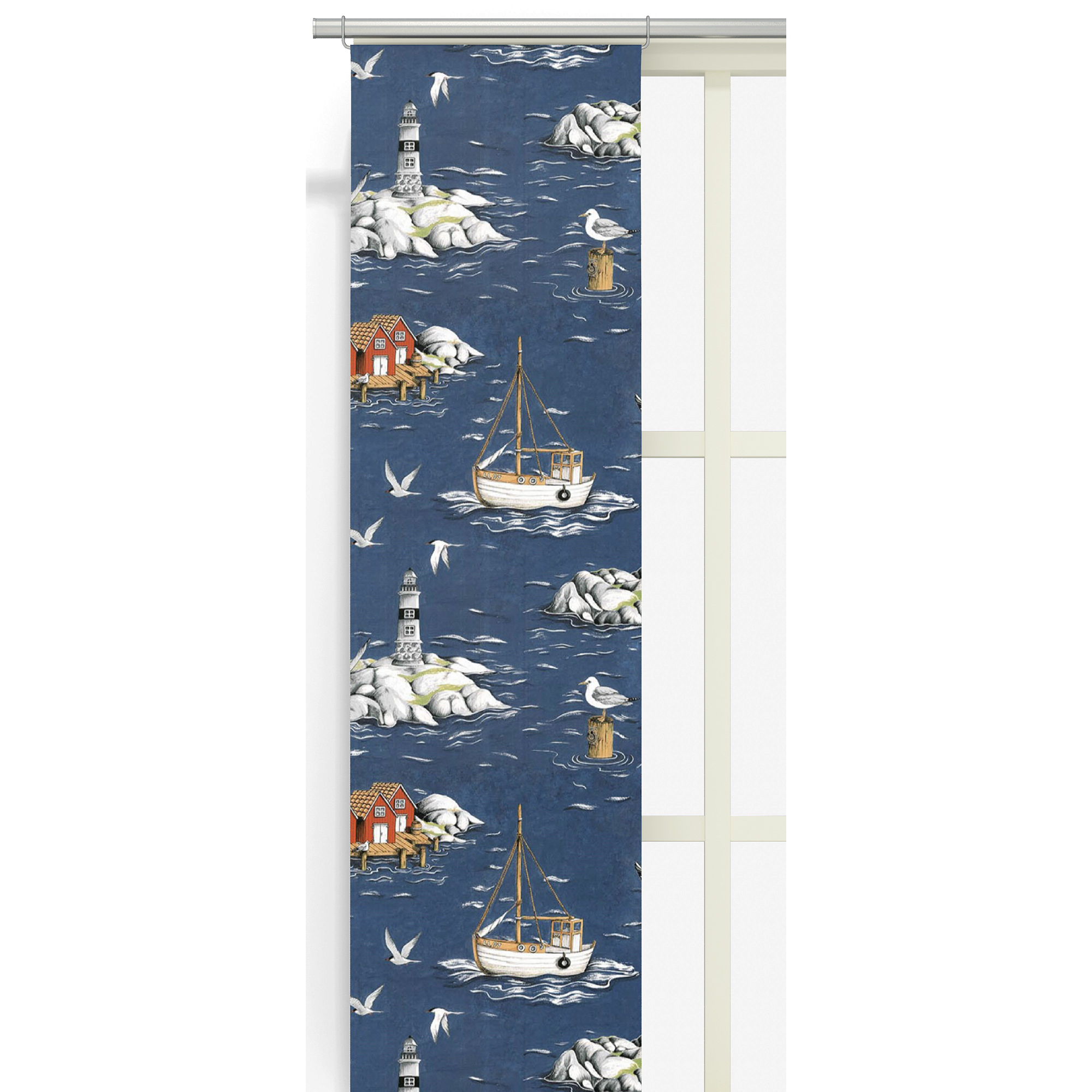 Panellängd Fiskeskär från Arvidssons Textil. Svenskdesignat mönster av Carola Bengtsson-Malmström. I härligt kustmotiv med båtar, bodar & fåglar. Tillverkad i bomull.