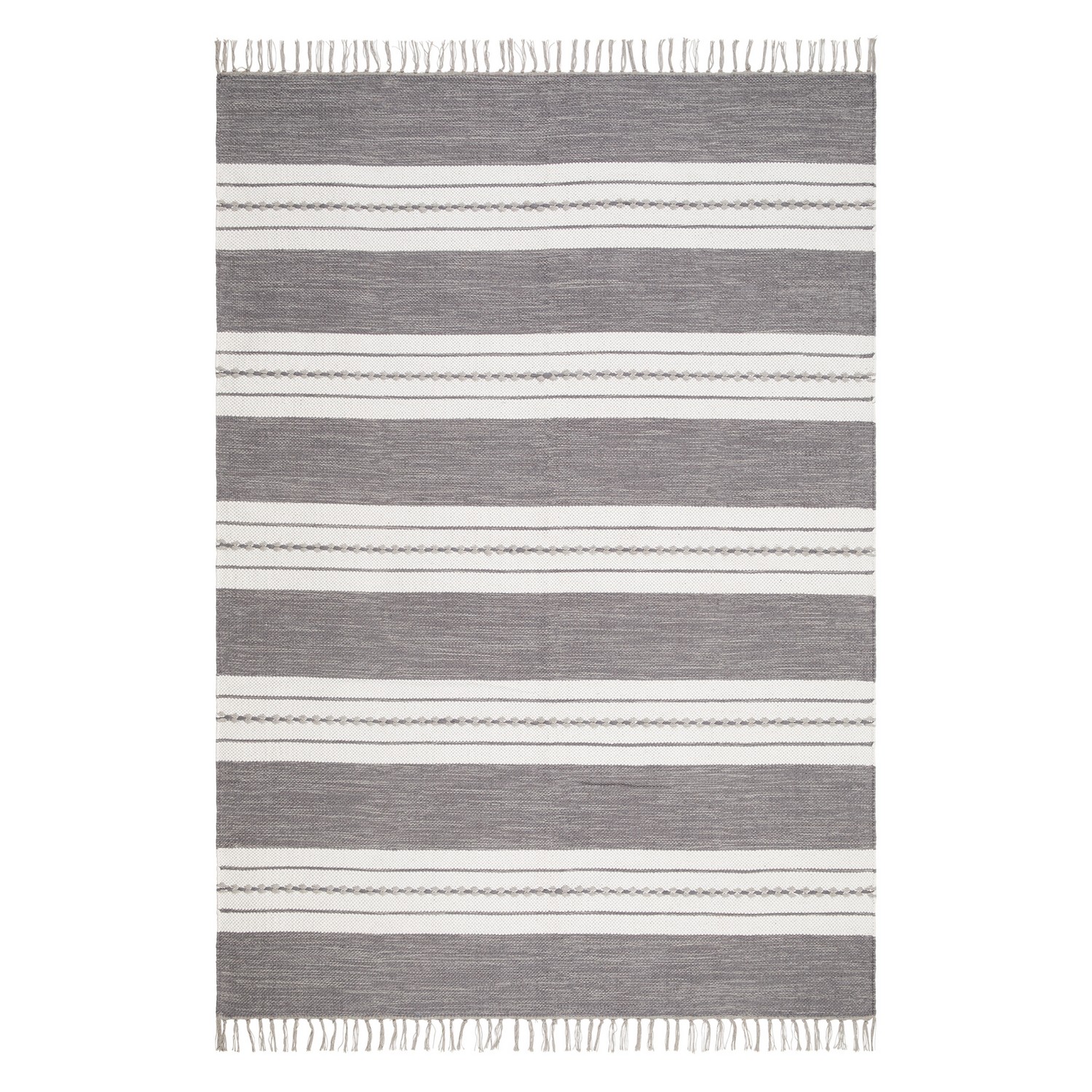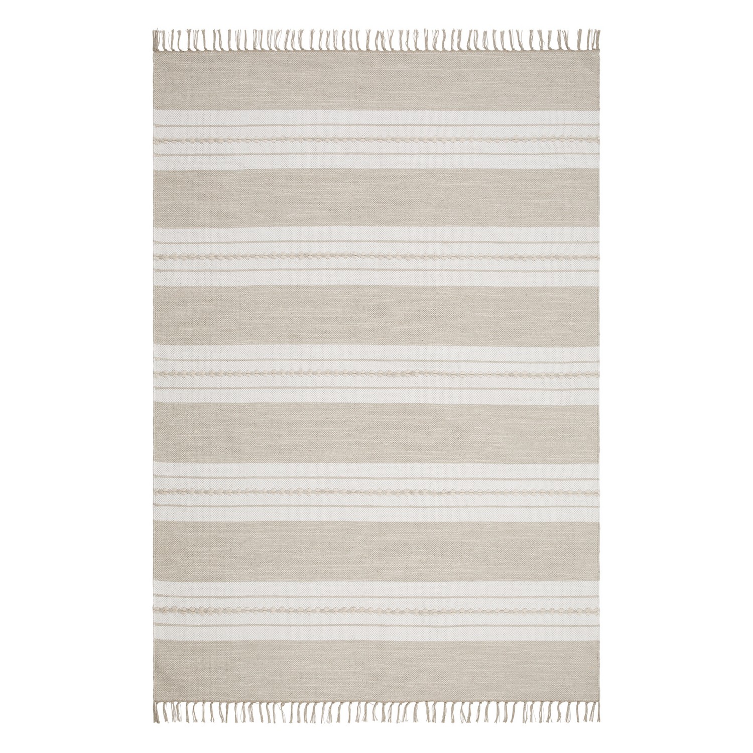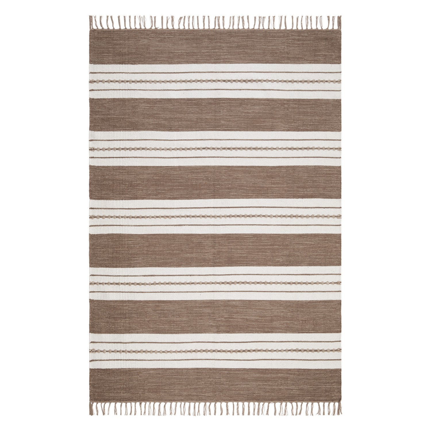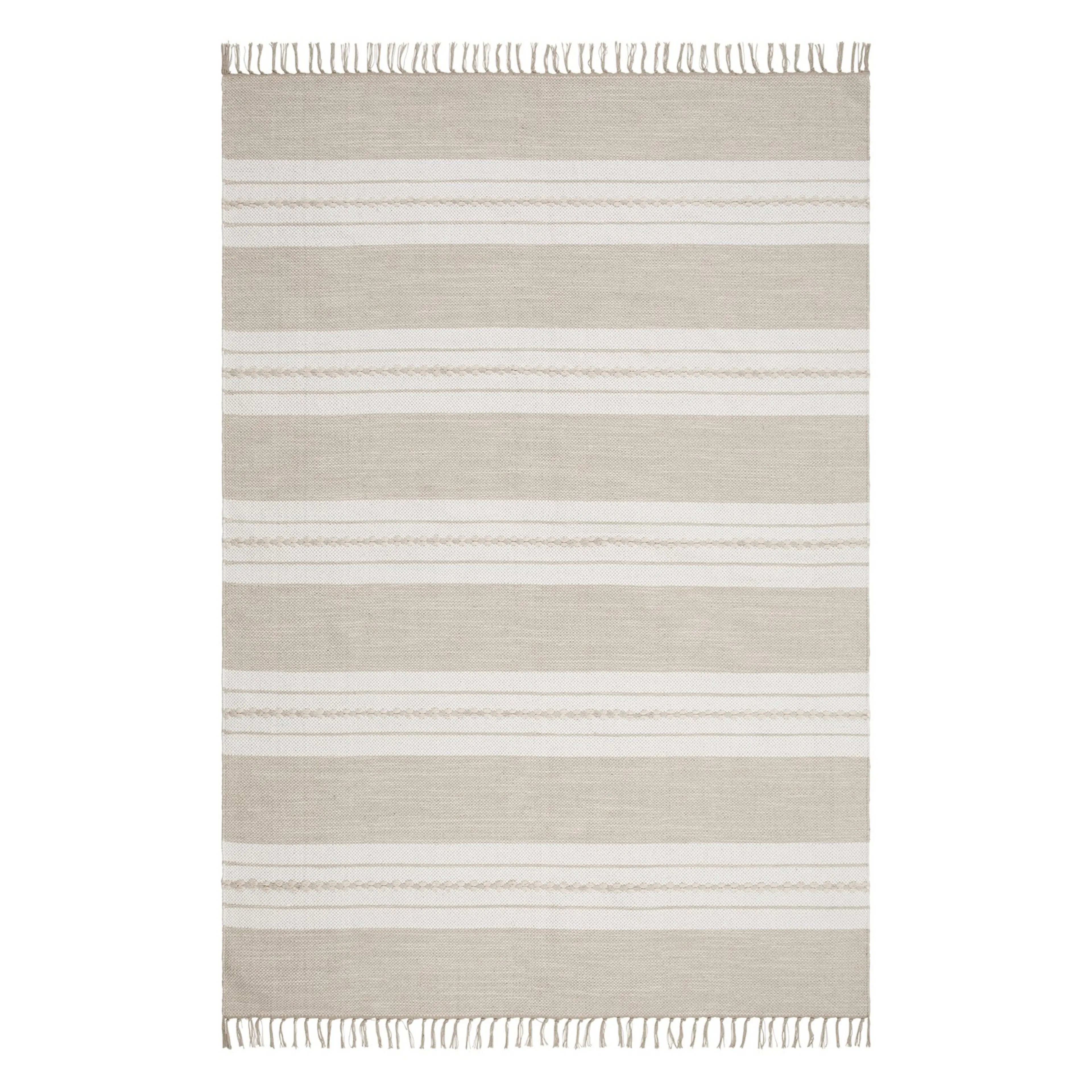 Sund är vävd med garn i tre färger. Mattans kortsida avslutas snyggt med en frans i ett matchande garn.
