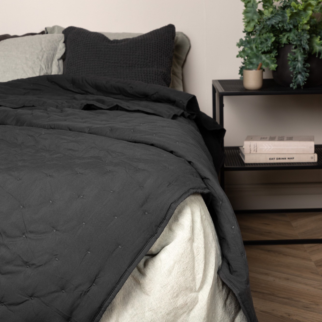 Sally är ett quiltat överkast med en mjuk och inbjudande känsla i en tvättad kvalité med broderade knappar. Överkastet ger en lugn och harmonisk känsla till sovrummet. Kombinera med annat överkast lager på lager i samma eller annat material för ett mer lyxigt intryck.