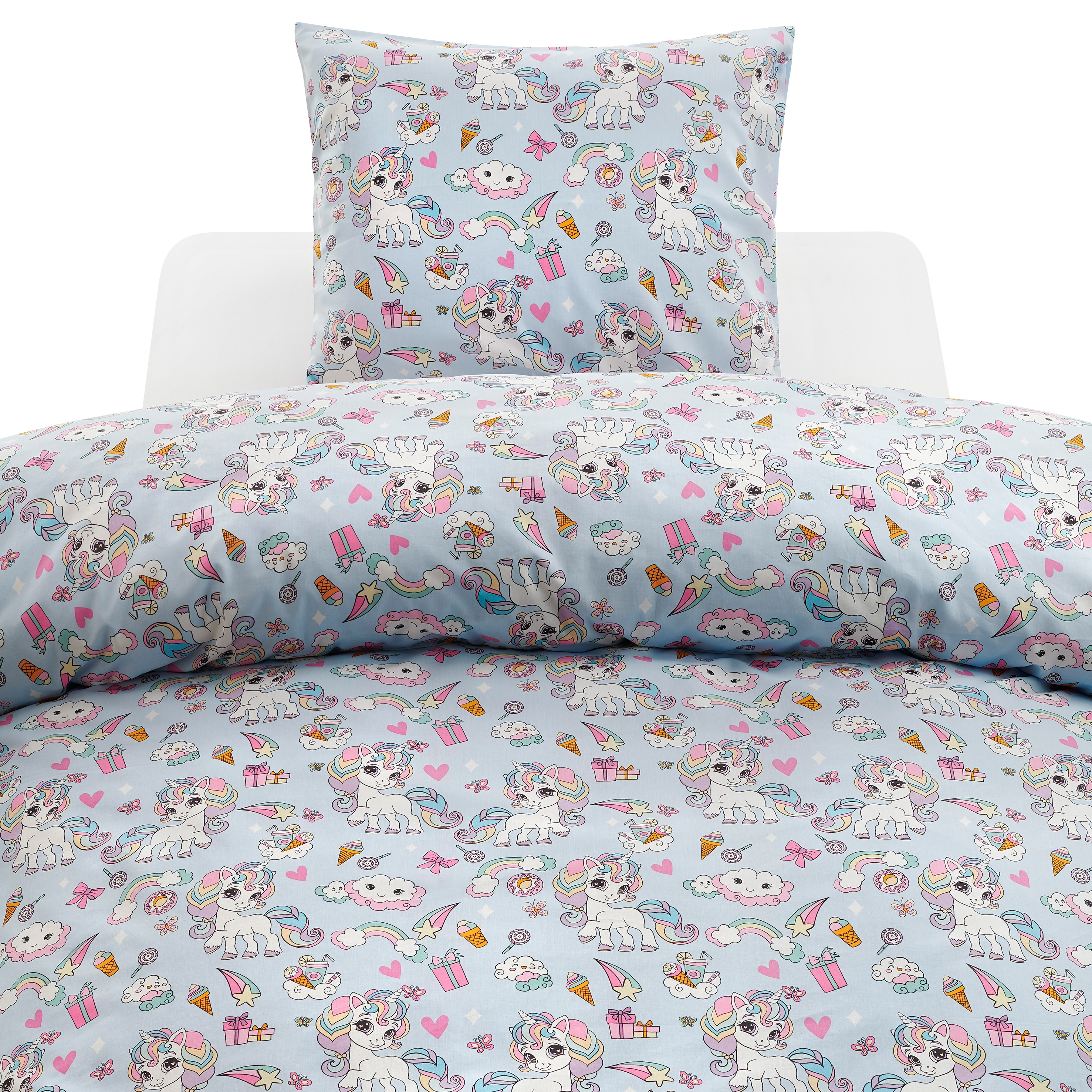 Borganäs bäddset med enhörningsmönster. Ett påslakan (150x210 cm) och ett örngott (50x60 cm), tillverkat av 100% bomull.