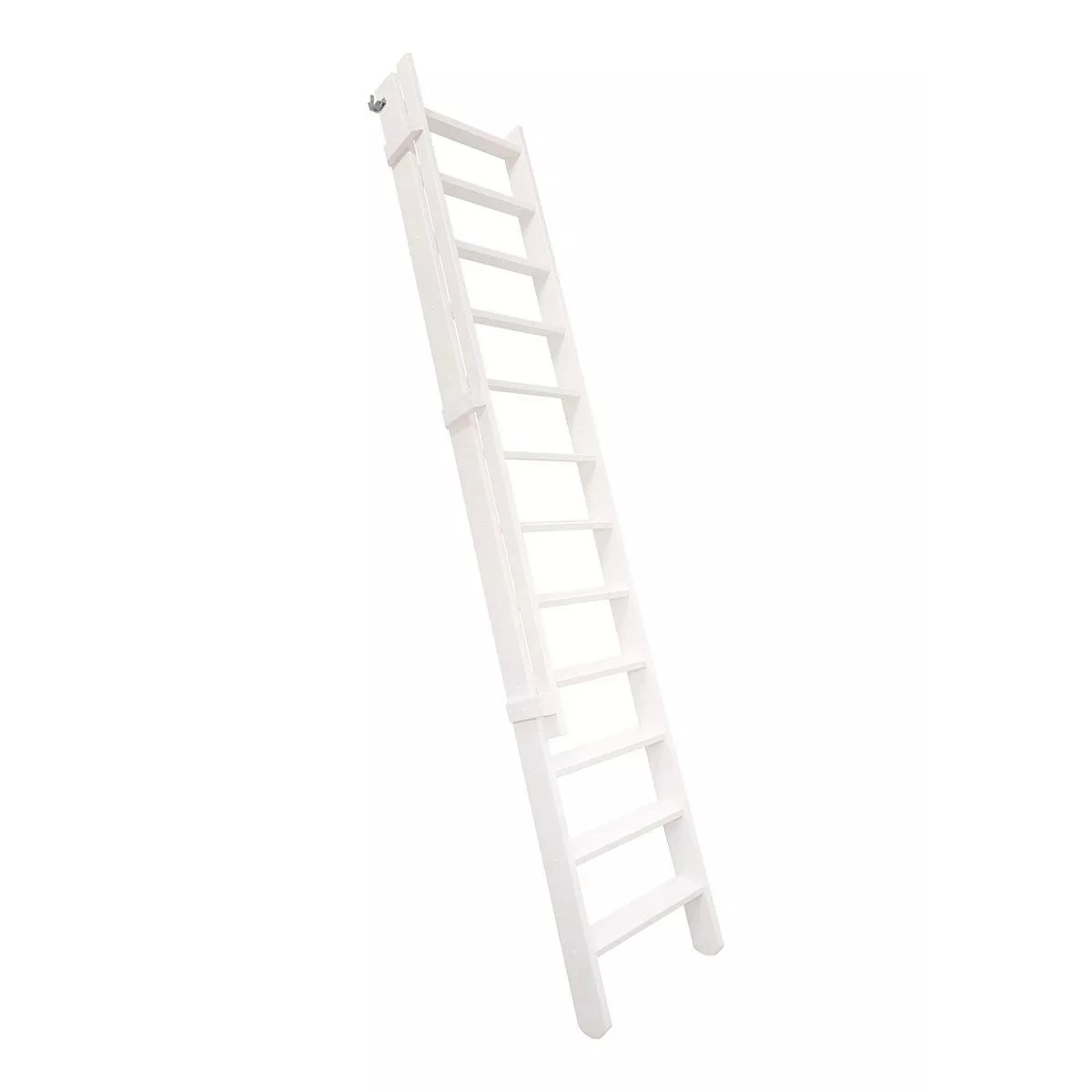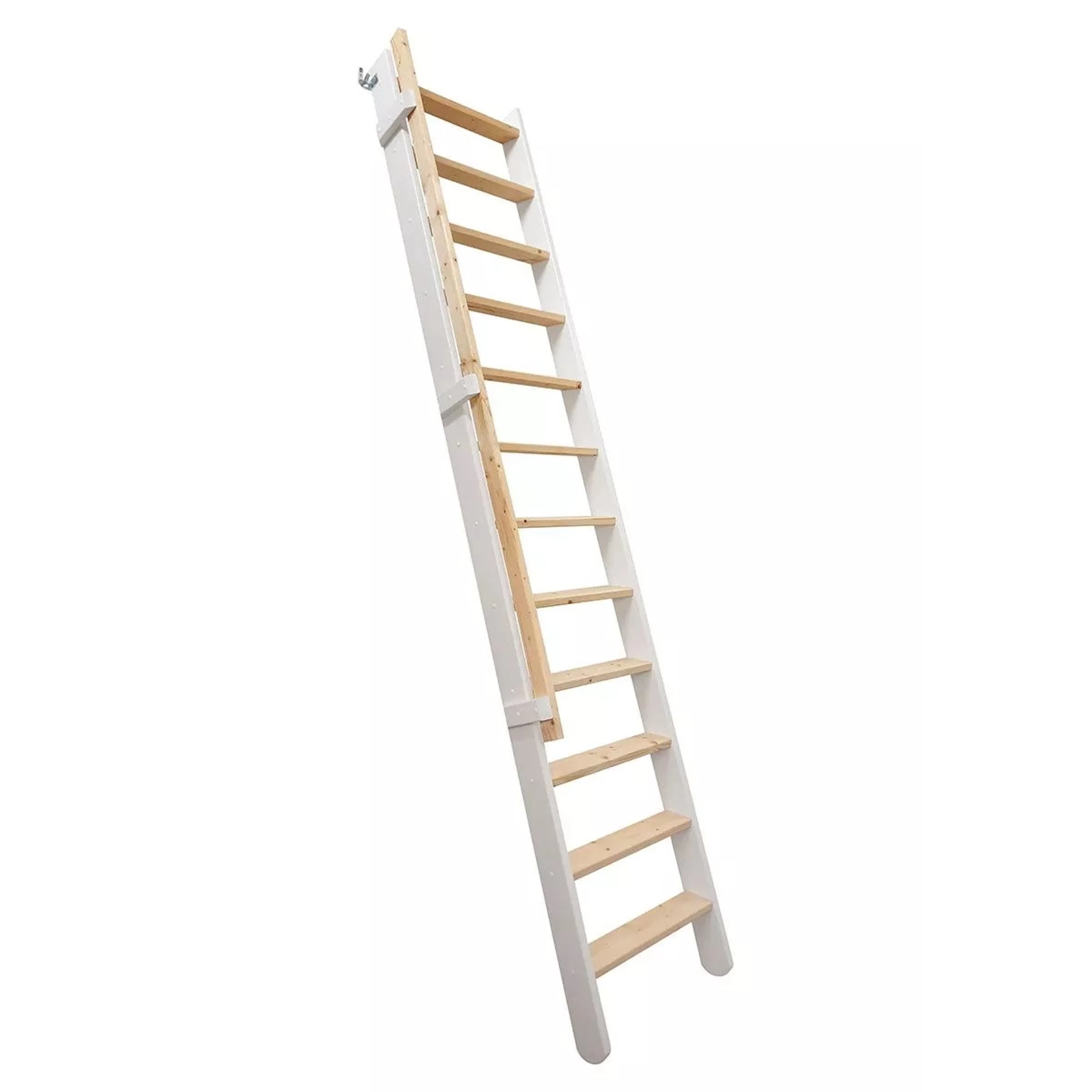 Krokar för montering ingår i paketet. Om stegen måste kunna skjutas ända in till väggen kan du köpa ett smart glidbeslag. När stegen är monterad med glidbeslaget uppnås en golvhöjd på 300,3 cm.