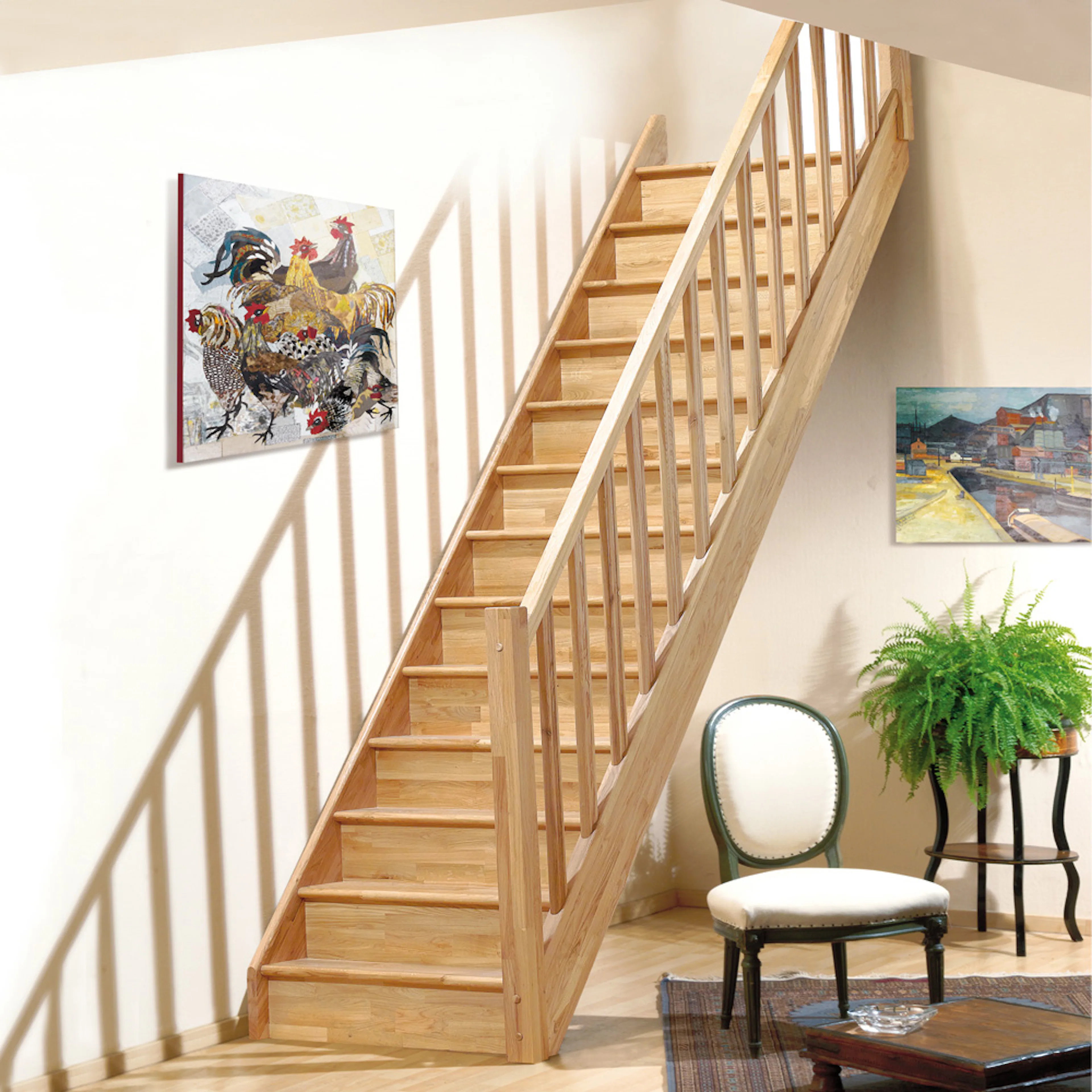 Lofttrappa för trånga utrymmen med massiva sättsteg.