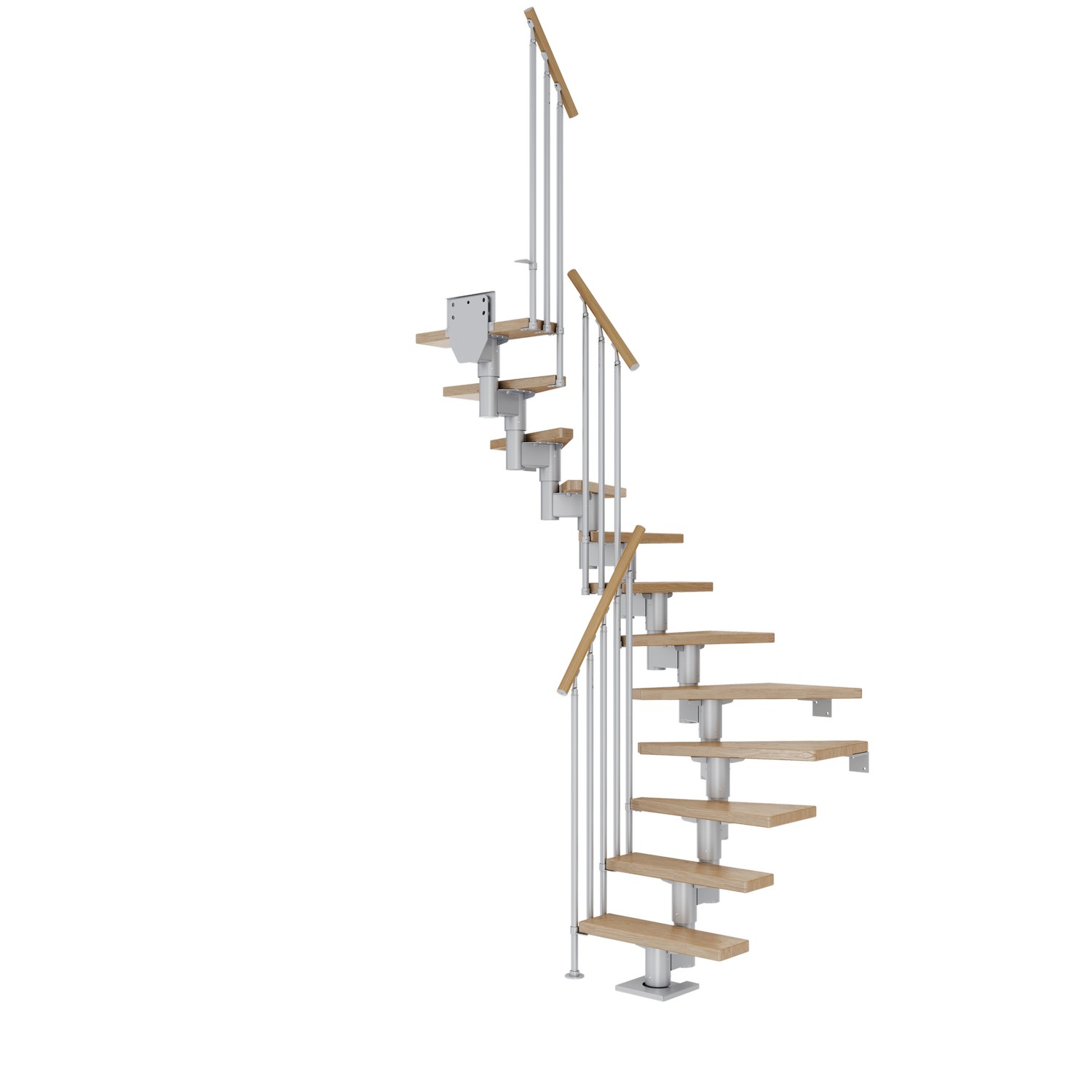11-15 massiva trästeg ingår som ger en maximal golv-till-golvhöjd på 360 cm. Vid 13-15 steg är det nödvändigt att installera stödstolparna som ingår i paketet. Om golv-till-golvhöjden inte är nödvändig avlägsnas steg helt enkelt tills önskad höjd nås. Trappans ytor är otroligt slitstarka, tål repor och är lätta att underhålla tack vare den halvblanka ytan. Höjden på varje steg kan justeras mellan 18,5 och 22,5 cm.