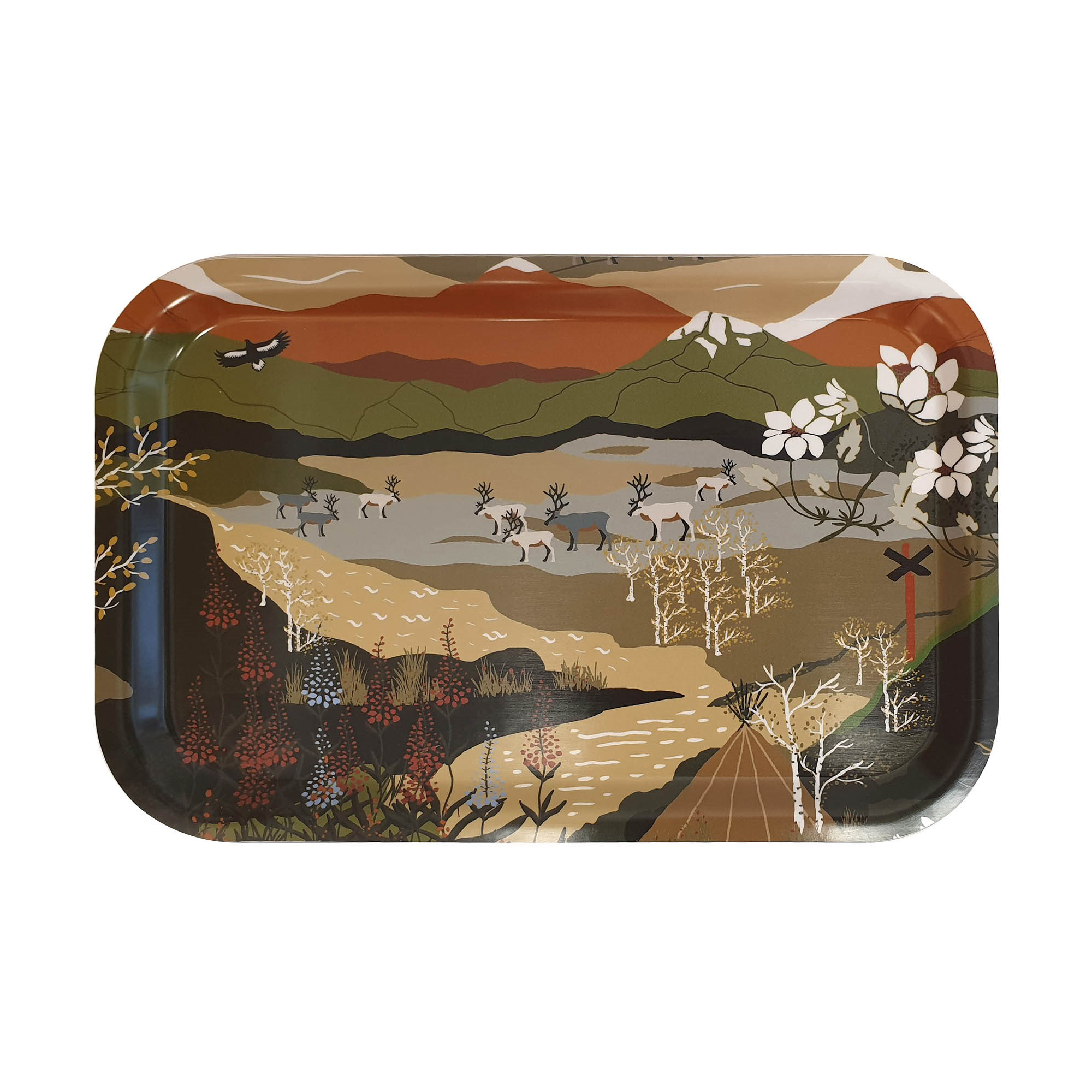 Bricka Fjällvandring från Arvidssons Textil. Svenskdesignat mönster med motiv av härliga fjällandskap med renar och solnedgången. Tillverkad i Sverige. Design av Louise Videlyck.