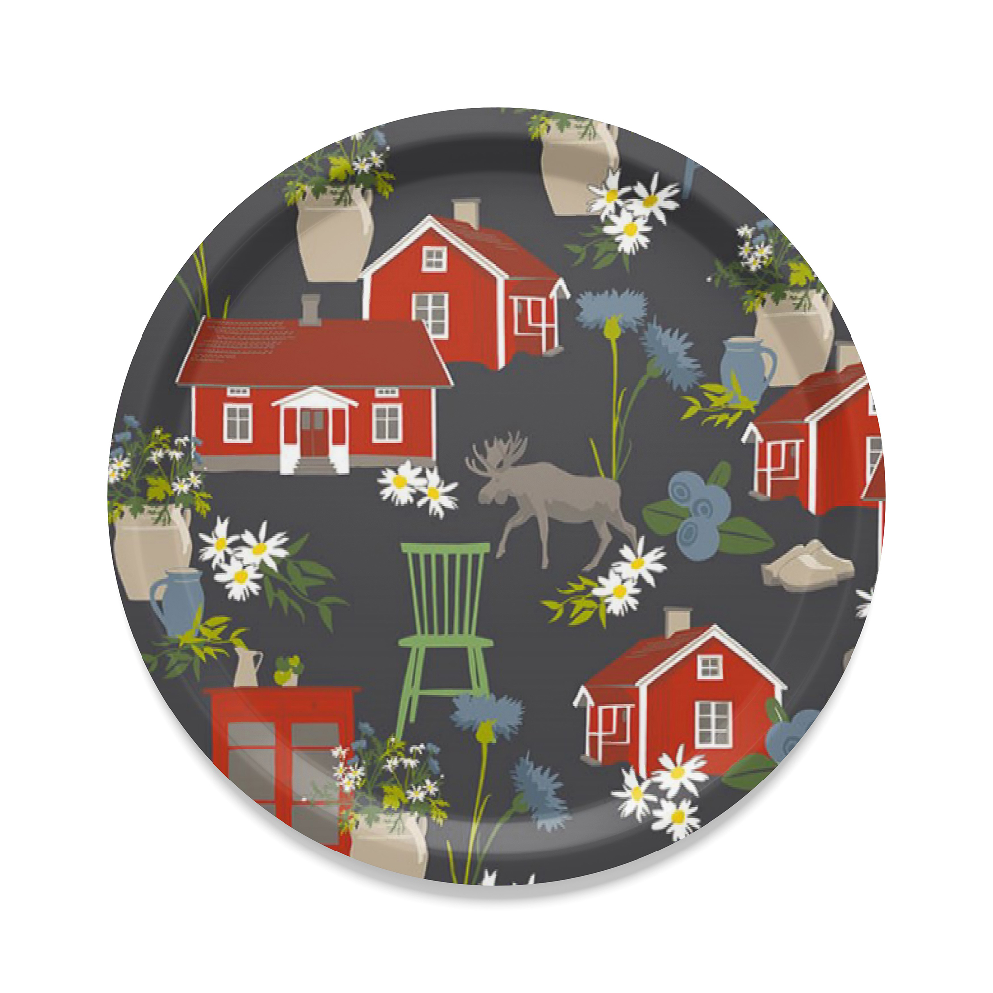Bricka från Arvidssons Textil. Svenskdesignat mönster med röda stugor, älgar och blommor. Tillverkad i Sverige.