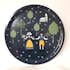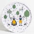 Rund bricka från Arvidssons Textil. Svenskdesignat mönster med människor i folkdräkt, midsommarstång & kyrkor. Tillverkad i Sverige.