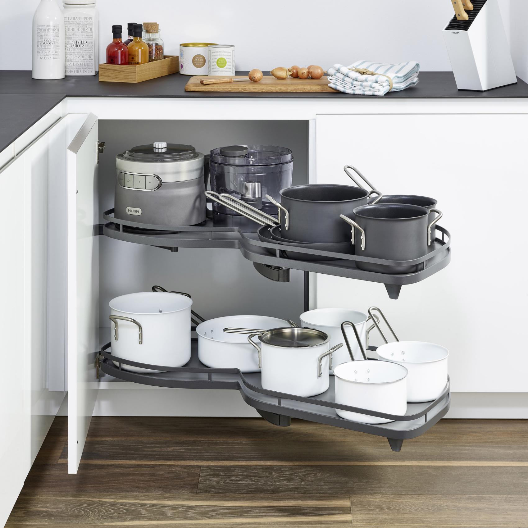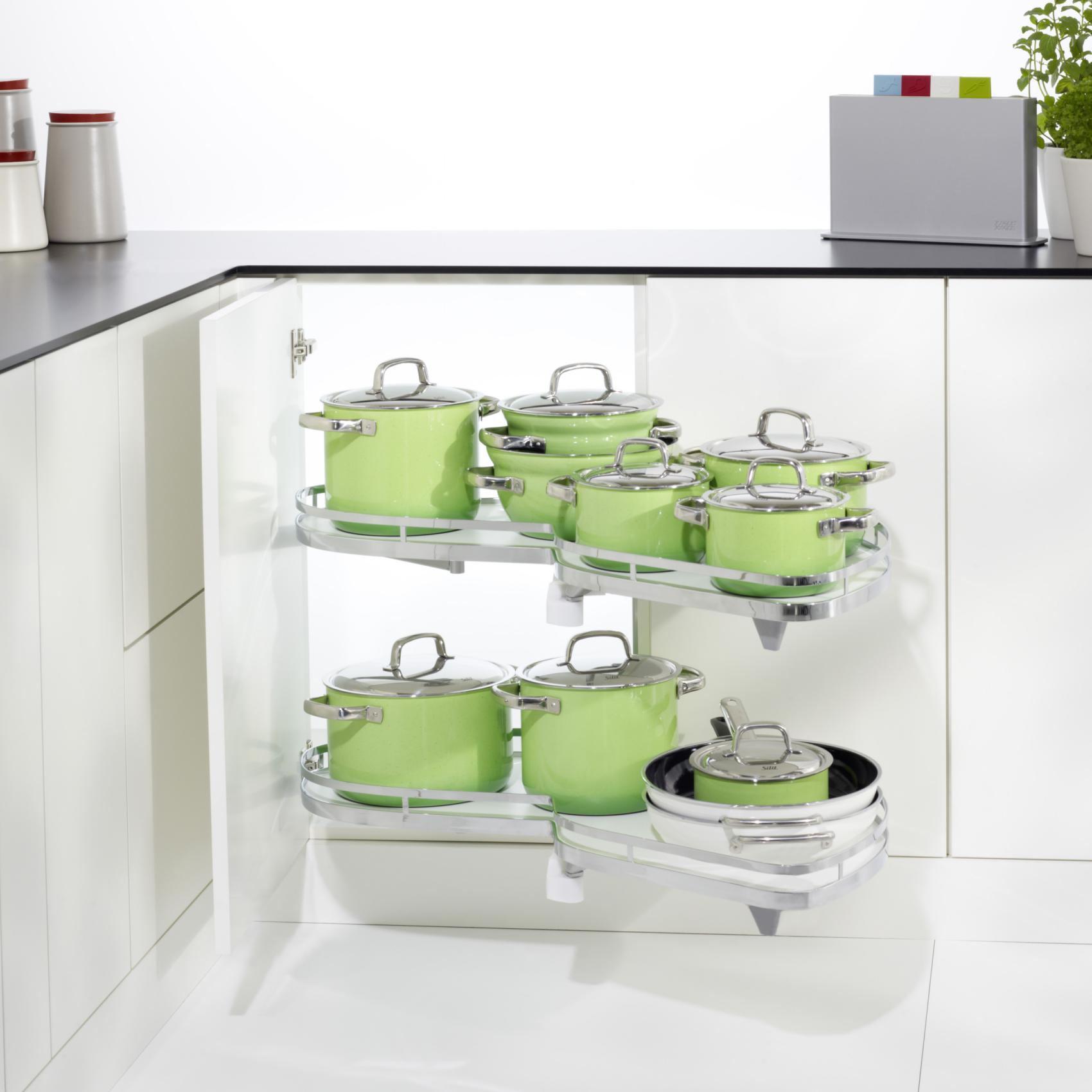 Det smarta hörnskåpsutdraget Le Mans II från Kesseböhmer kombinerar elegant design och funktionalitet. Med 85° öppningsvinkel optimeras lagringsytan i skåpet.
