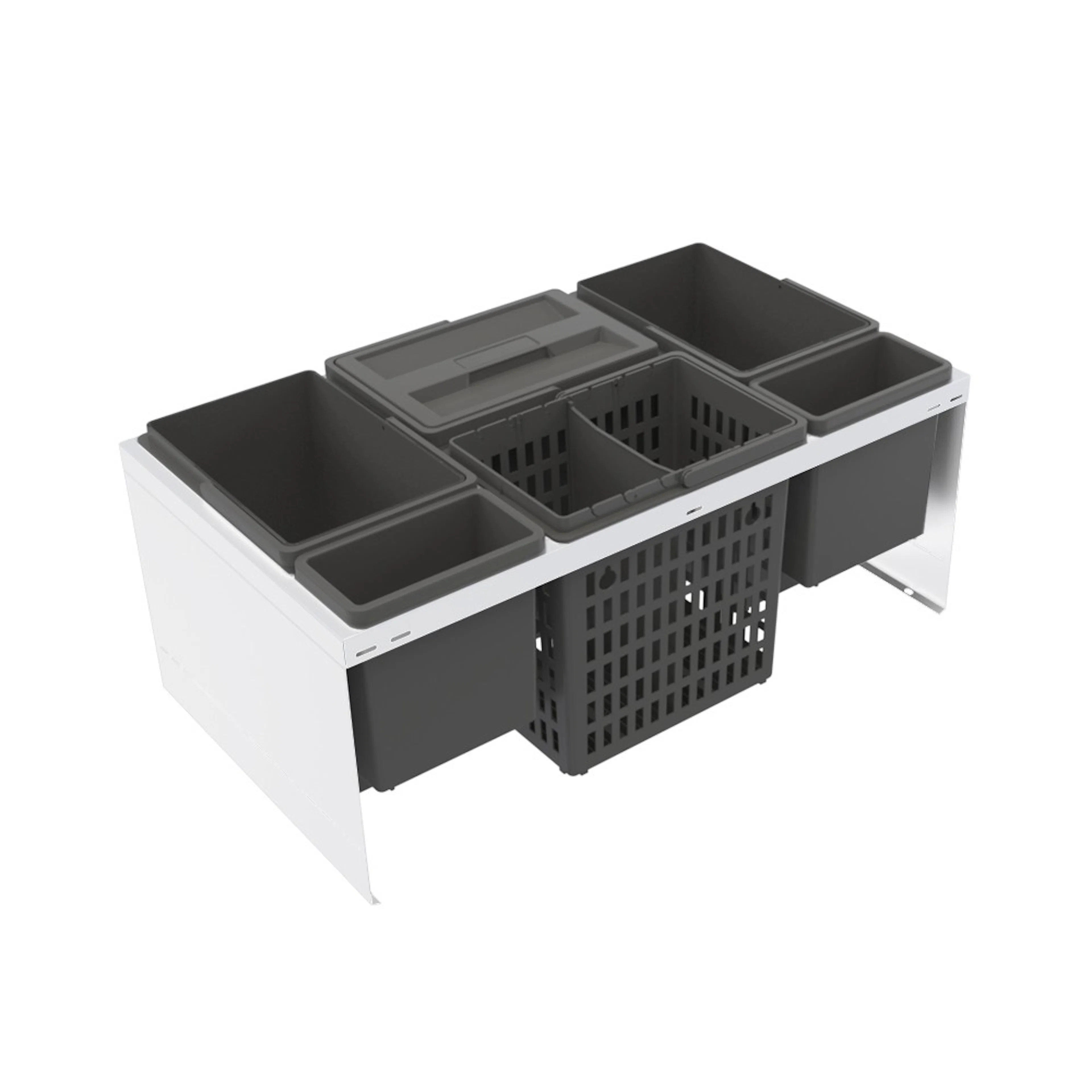 Källsortering Beslag Design Cube Original Hero 800 är ett elegant utformat avfallssystem med gott om extra kärl och förvaring. Sidorna av metall fungerar även som avdelare i lådan. Den monteras i botten och fronten av lådan och passar lådor av både trä och metall.