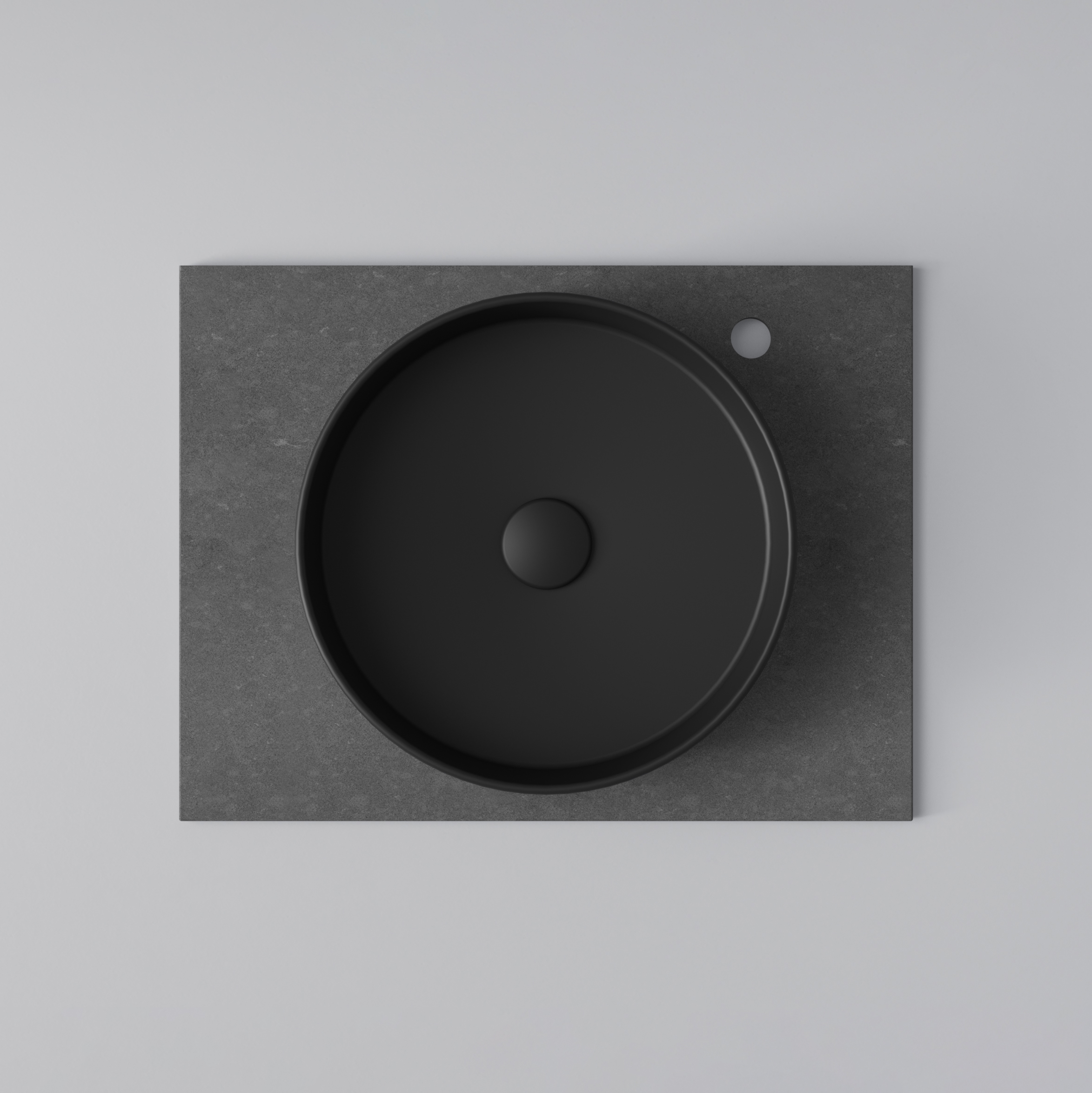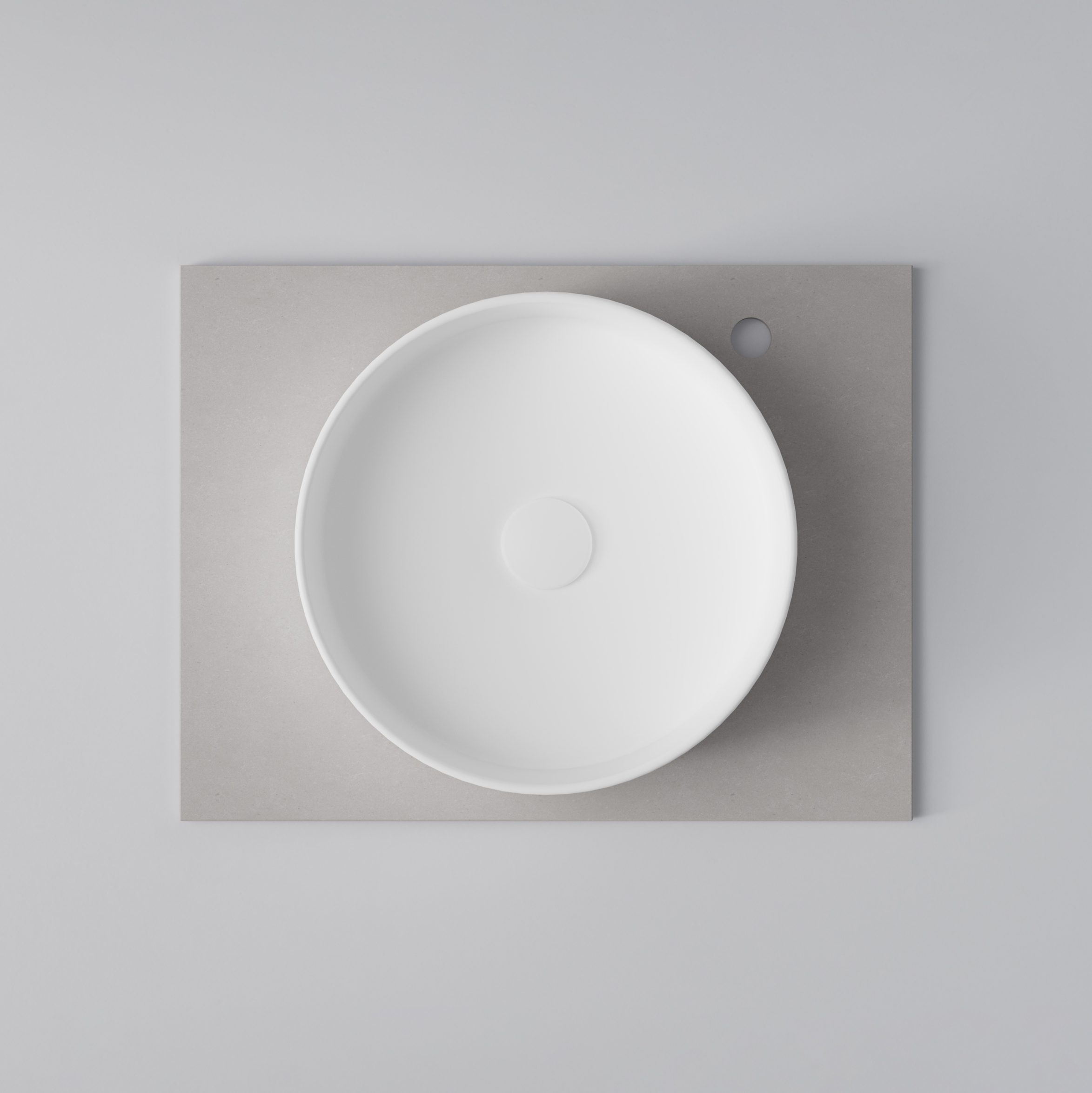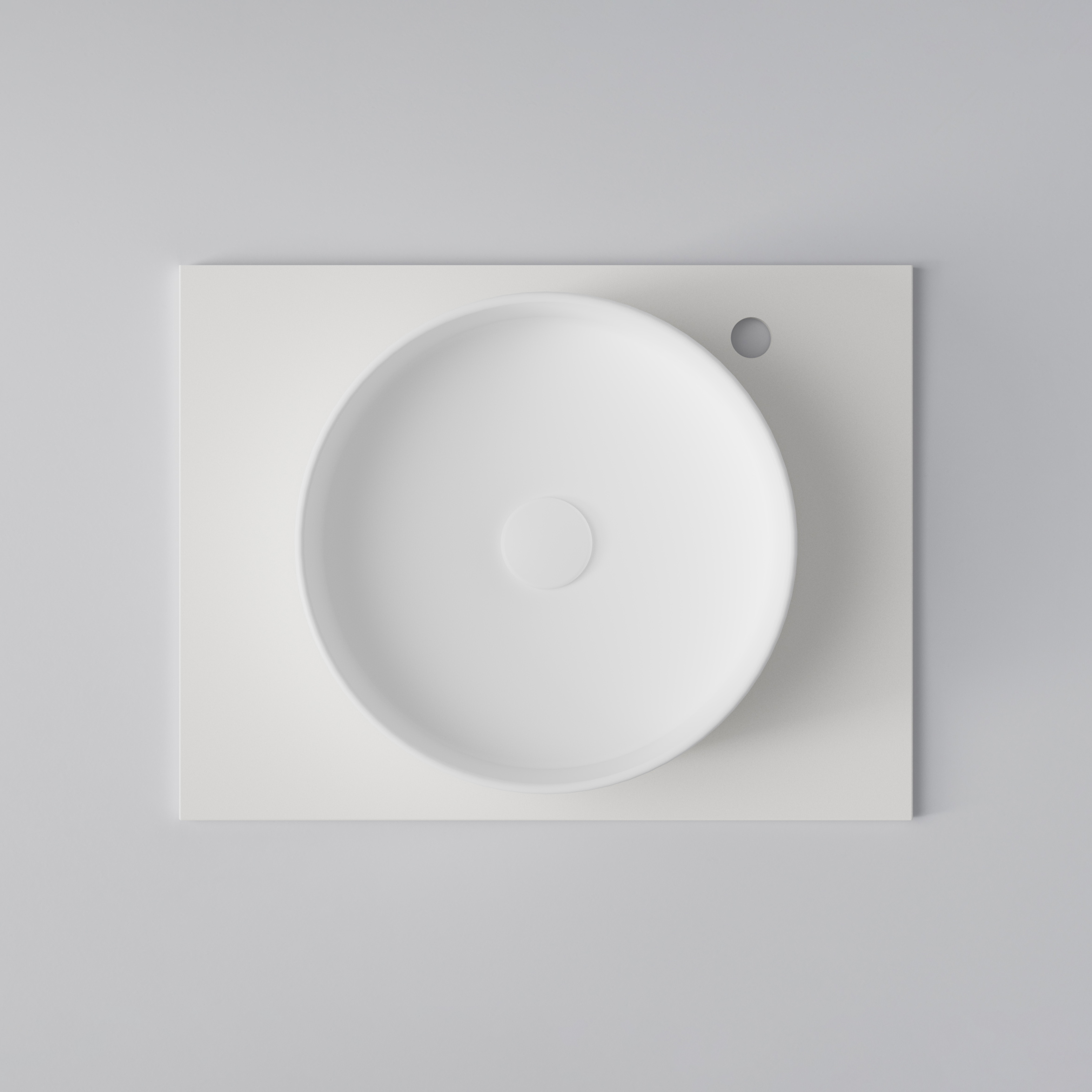 Bänkskiva INR Flow är en tålig bänkskiva i två olika material, Solid surface och kvartkomposit. Till fristående tvättställ.