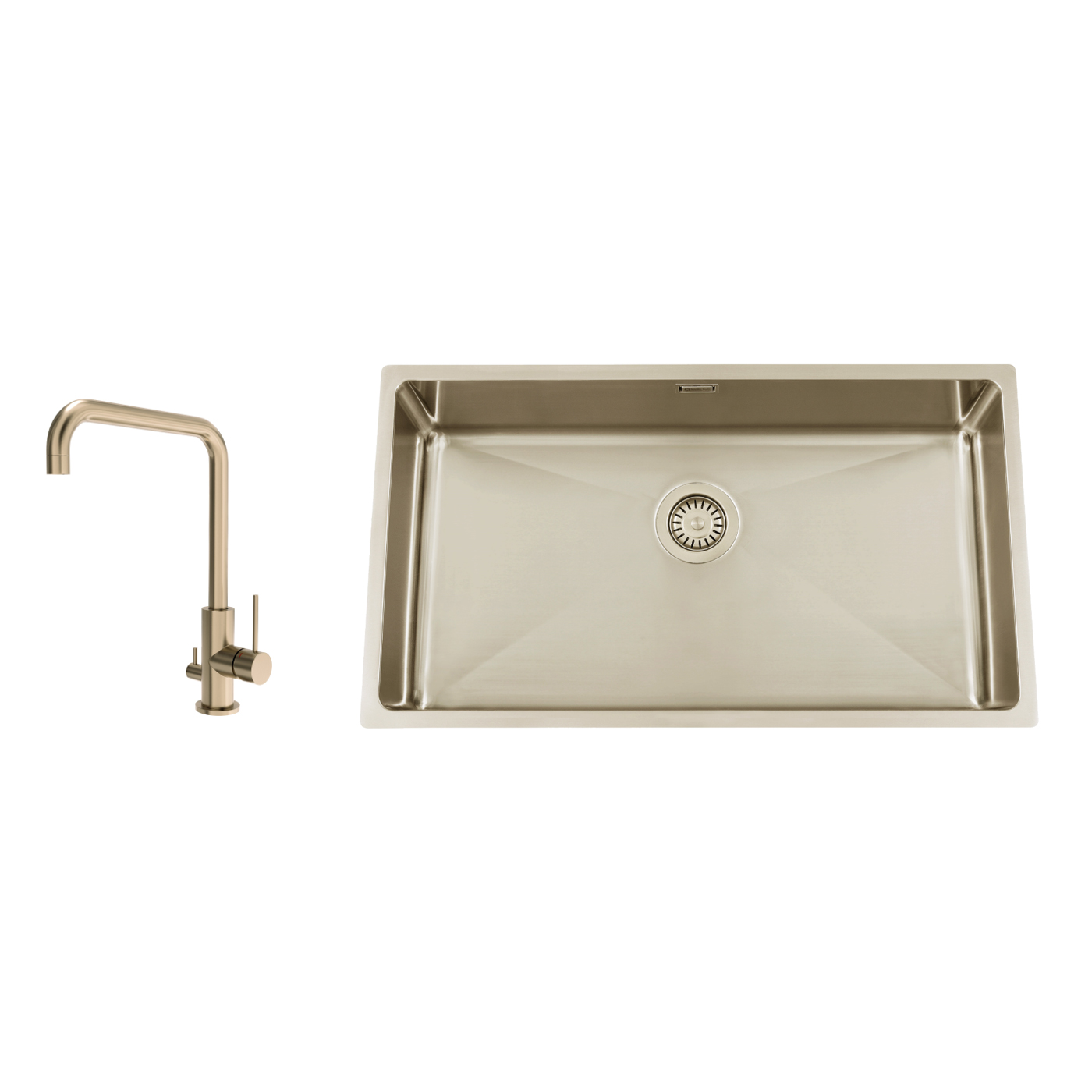 Disklåda Nordic Tech Titan 730 X med Köksblandare Steel Mood D är en kraftig disklåda i 1,2 mm rostfritt stål med snyggt borstad yta för min 800 mm skåp i kombination med en stilren köksblandare från Primy.