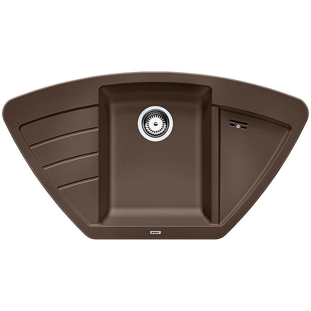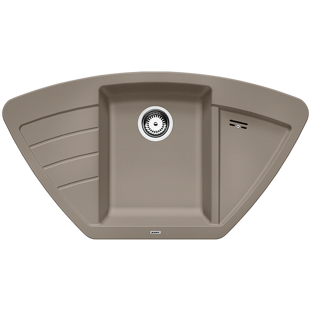 Hörndiskbänk Blanco Zia 9 E är en stilren hörndiskbänk av silgranit. Den har 3½" avlopp med korgventil, en avställningyta och en avrinningsyta.