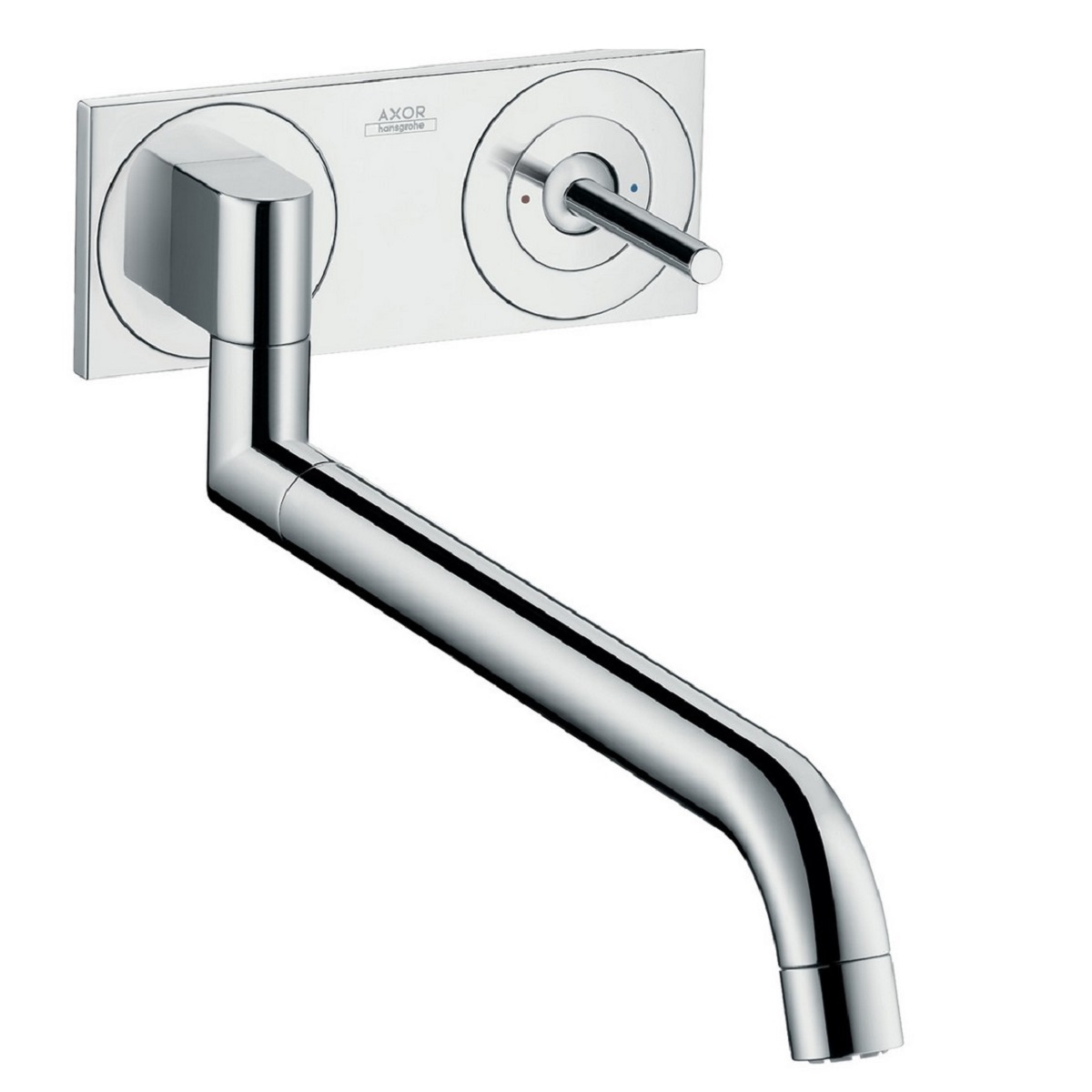 Köksblandare Axor Uno För Vägg från Axor är en stilren 1-greppsblandare för väggmontering. Den har en svängbar pip 110° / 150° och teleskopisk pip 380-500 mm. Kranen kan placeras till höger eller vänster. Vattenflöde 9 liter/minut.