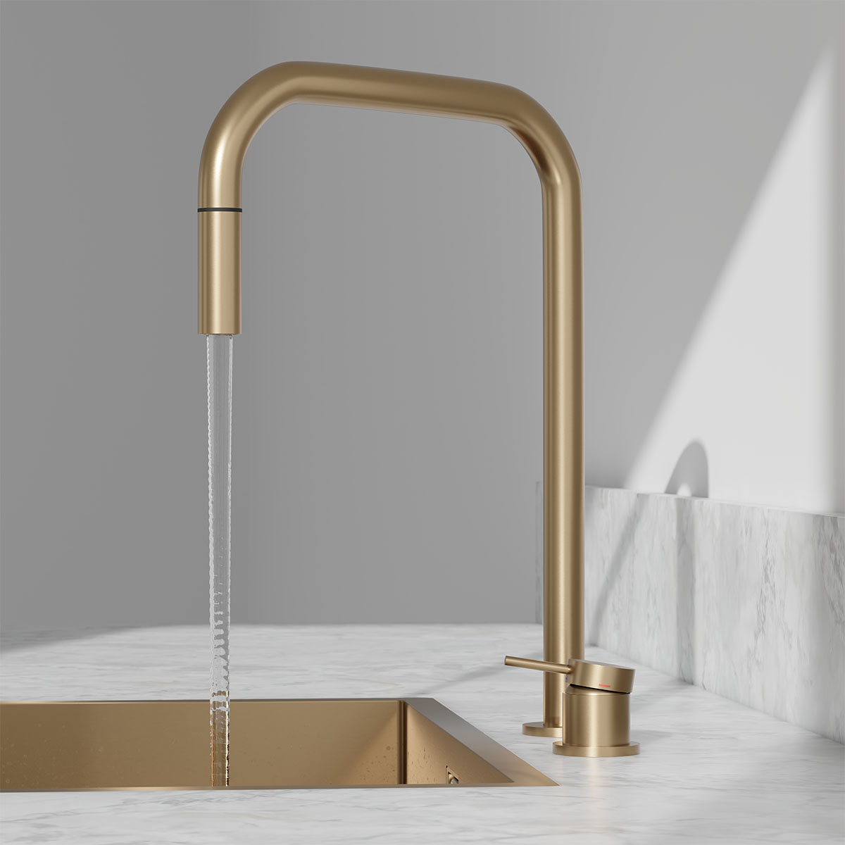 Köksblandare Scandtap Harmonized K2P Square med separat pip och vred. Avskalad slim design där mjuka former och raka linjer samspelar och förhöjer. Avstånd och vinkel mellan handtag och pip kan anpassas efter personlig smak och behov. Formgiven med ett diskret utdragbart munstycke för smidig rengöring. Ett designelement med både subtil och utsökt närvaro.