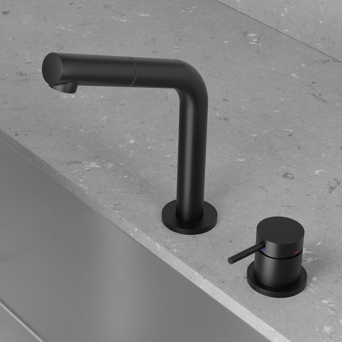 Tvättställsblandare Scandtap Steel Harmonized B2P med separat pip och vred. Stilren minimalistisk design och praktisk utformning. Formgiven med ett diskret utdragbart munstycke för smidig rengöring. Avstånd och vinkel mellan handtag och pip kan anpassas efter personlig smak och behov.