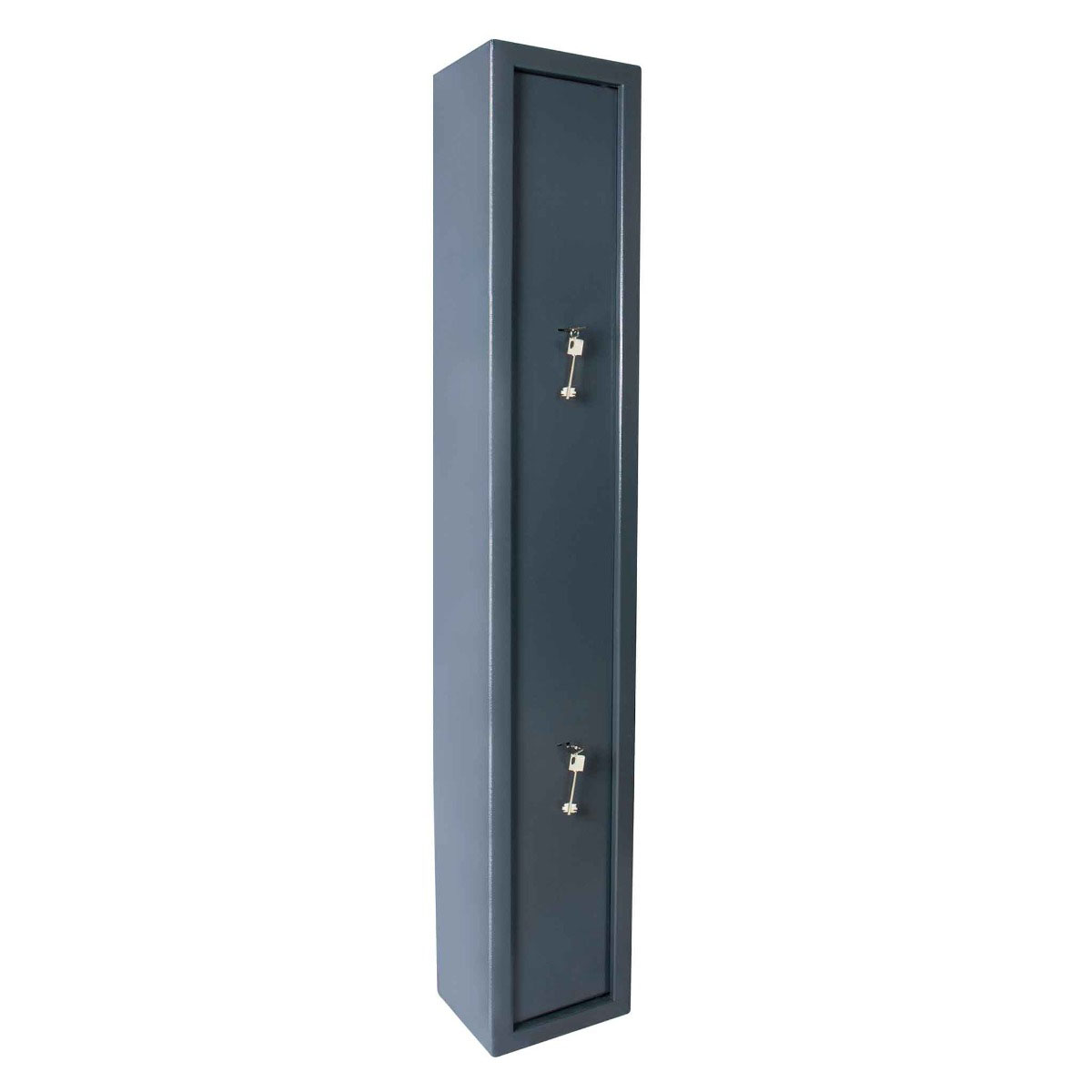 Detta vapenskåp, som passar även i ett litet utrymme, har två lås på dörren, tack vare vilka du kan förvara dina vapen säkert. Du kan förvara patroner eller andra viktiga föremål i ammunitionslådan högst upp i vapenskåpet.