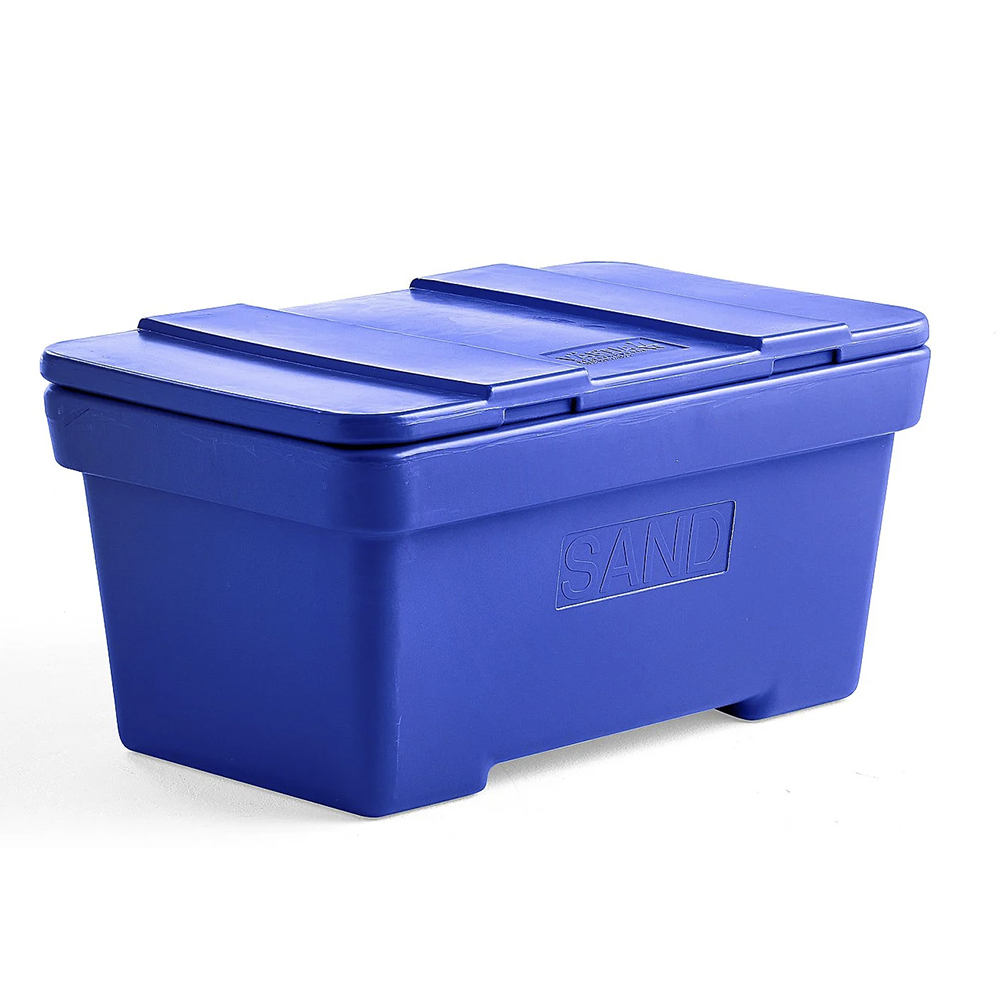 Lådan är tillverkad i återvinningsbar polyeten vilket gör den både miljövänlig och hållbar. Polyeten är ett slitstarkt material och håller därför länge. Den smarta konstruktionen gör att locket minimerar risken för kondens vilket sedan lätt leder till isbildning av innehållet. Gångjärnen är integrerade i konstruktionens baksida vilket gör att beslagen inte rostar. Sandlådan har ”SAND” ingjutet i lådans front, vilket gör att det inte slits bort. Lådan passar perfekt på parkeringar, vid gångbanor och järnvägsstationer.
