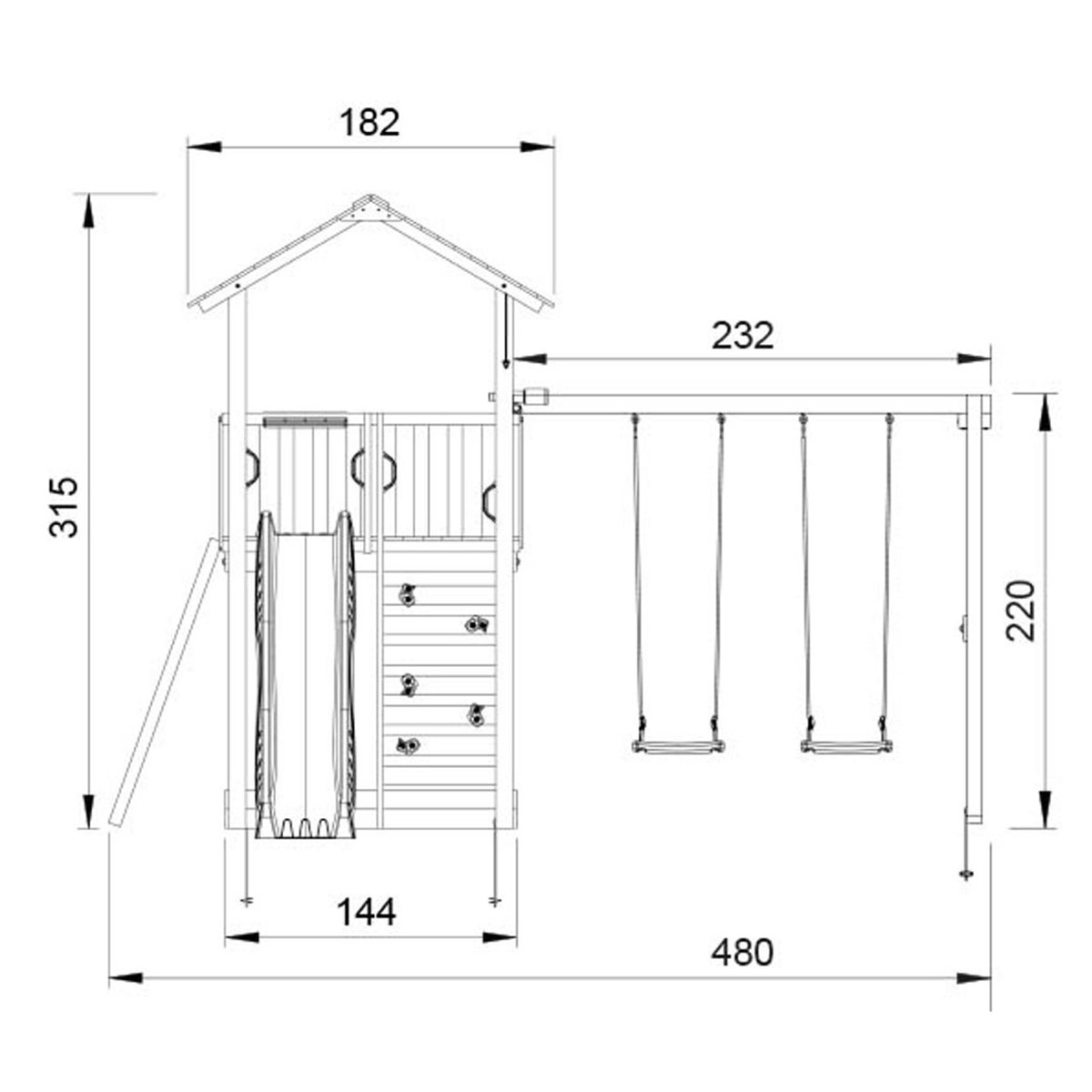 - Yta exkl. säkerhetsyta gungmodul: B: 220 x D: 235 x H: 215 cm