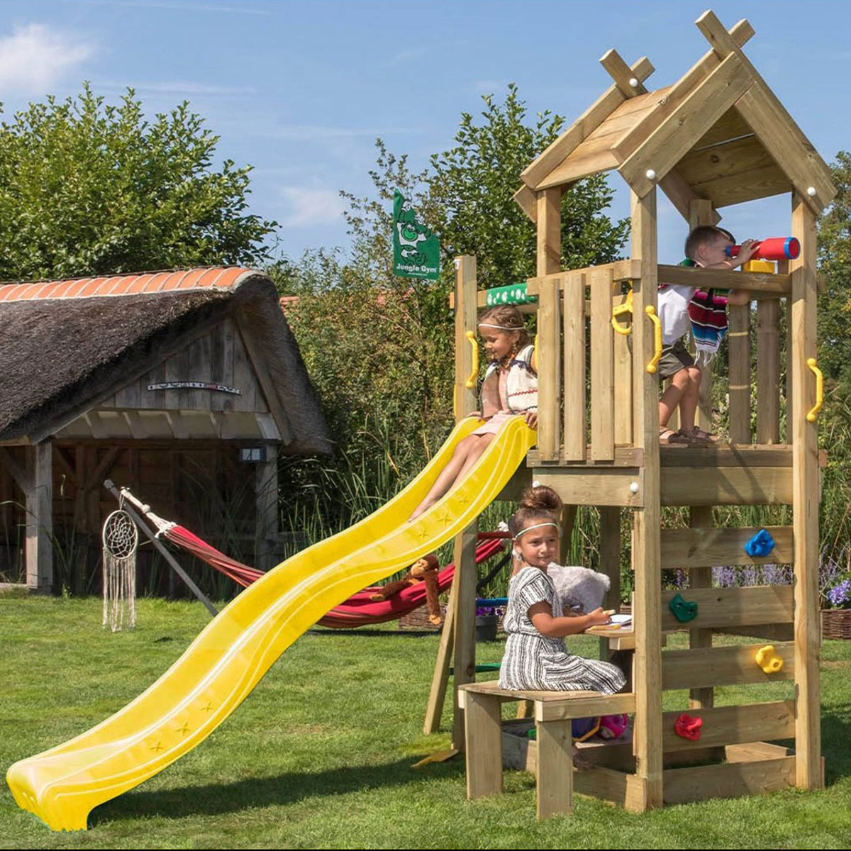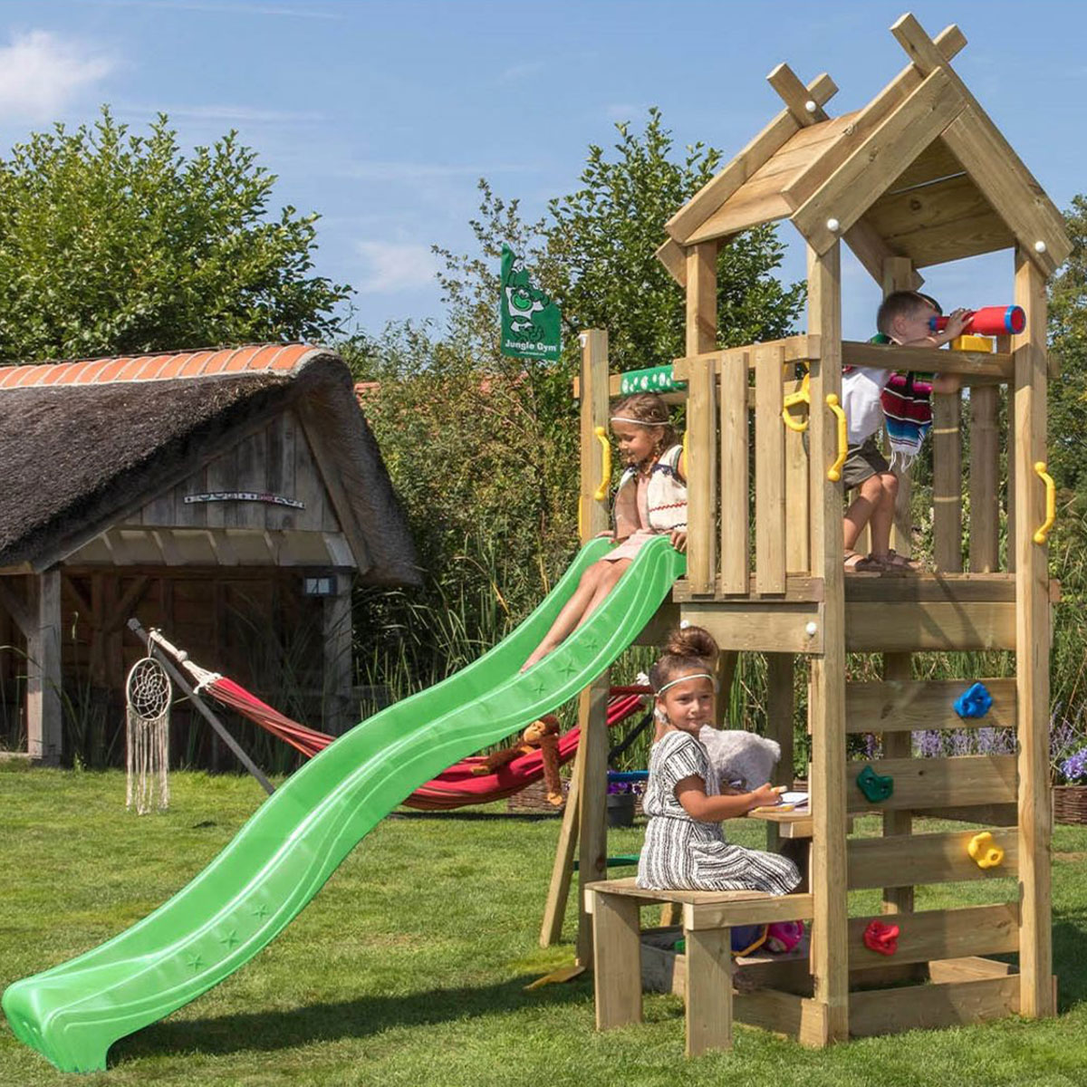 Mysig och hållbar, dina små kommer att känna sig som hemma i Jungle Teepee. Denna kompakta klätterställning för barn stjäl showen, inte trädgården. Sök lä på lekplatsen, klättra på en klättervägg eller lutande stege, eller gör en fest vid picknickbordet. Jungle Teepee ger den rustika landskapslooken till din bakgård. Mellan det medföljande picknickbordet, sandlådan, klätterväggen, ratten, teleskopet och mer tror vi att vi har hittat definitionen av roligt. Eftersom säkerheten är av största vikt innehåller denna barnklätterställning även många smarta detaljer som jordankare, tvådelade bultkåpor, säkerhetshandtag och huvudskydd.