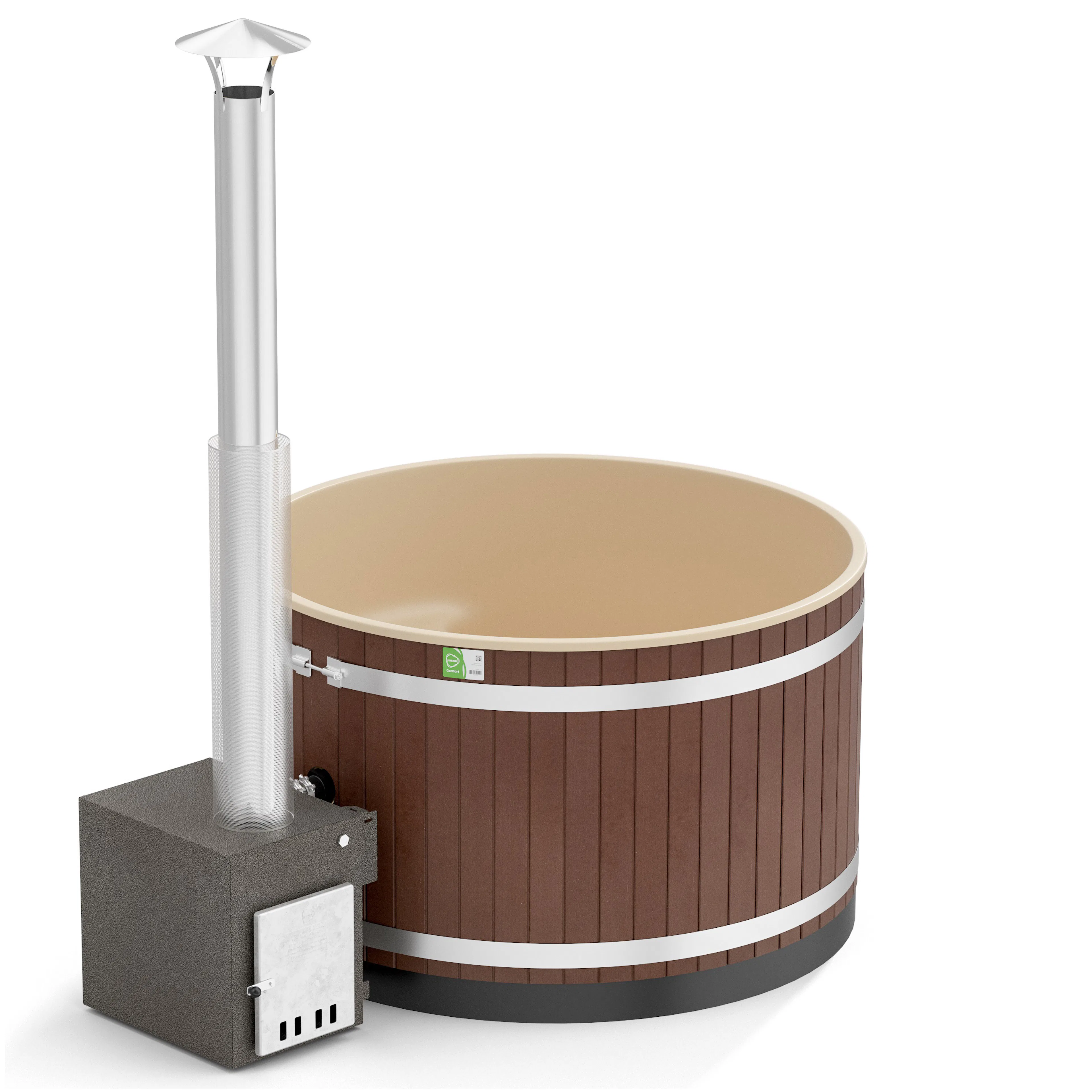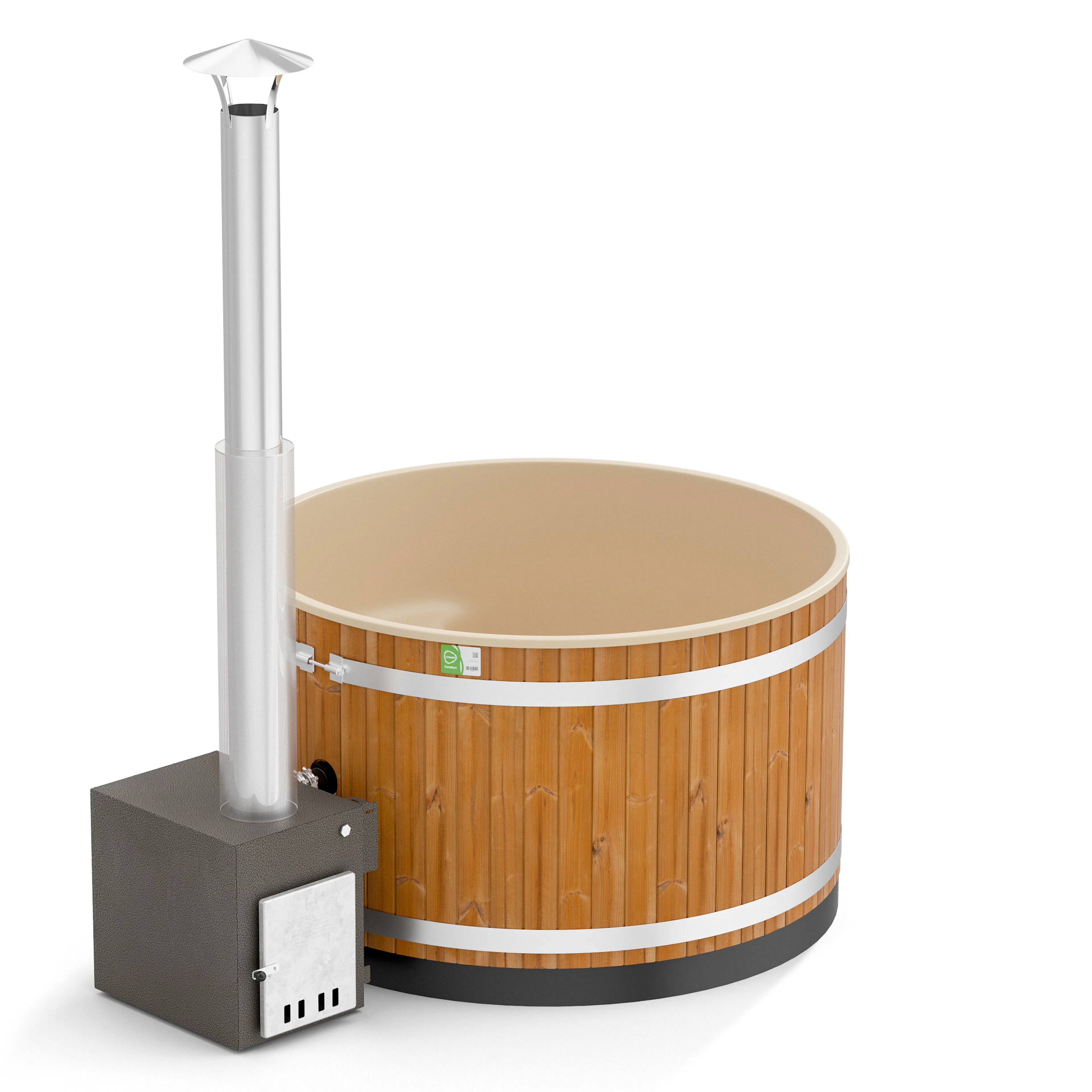 Med den externa vedkamin Macu, 40 kw som har en nettoeffekt på 29 kW så värms badtunnan normalt upp, 4-38°C på lite drygt 2 timmar när man eldar med bra ved, björk. Samt att man har täcklocket och ett extra isolerande underlock som håller värmen kvar under vattnet, (tillbehör). Uppvärmningstiden blir normalt längre vintertid, då man kan räkna med närmare 2,5 timmar med denna vedkamin. Vedkaminen rymmer mycket ved och klarar av upp till 57 cm lång ved. Vedkaminen är grundutrustad med 2 meters stadig rostfri syrafast modulskorsten och 1 meters värmeskydd samt en ordentlig skorstenshatt som hindrar regn. Skorstenen kan enkelt och stadigt förlängas med fler 1 meters skorstensmoduler. Eldas björkved så räcker normalt dem medföljande skorstenshatten men eldar man med gran-, tall- eller spillvirke så kan en förlängning av skorstenen och ett gnistskydd vara ett bra alternativ. Den externa vedkaminen blir inte speciellt varm på utsidan då den är vattenmantlad, den är helt omsluten av badvattnet i dess tak, väggar och golv.