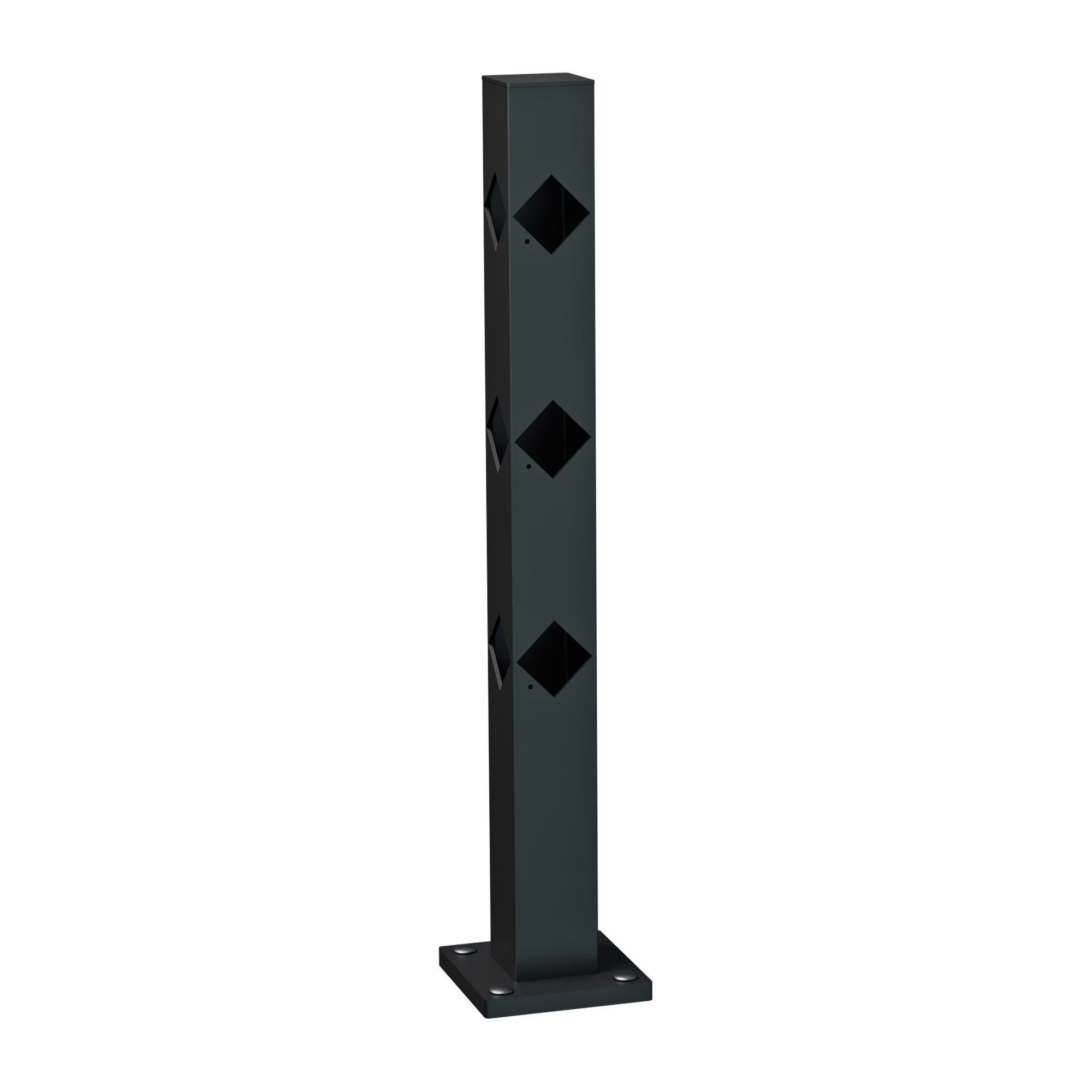 Avståndet mellan marken och första regeln är 24,5 cm. Avståndet mellan reglarna är 12,5 cm. Hålen är 45x45mm. Tänk på att beställa rätt stolptyper för ditt ändamål (mellanstolpar, hörnstolpar, ändstolpe) Stolphatt går att få i svart plast eller av aluminium i valfri kulör. Glöm inte att beställa en stolpfot till varje stolpe. Köp valfritt obehandlat virke 45x45mm hos din lokala bygghandlare. Måla sedan i valfri kulör. Säkerställ att virket inte har svällt för mycket (det försvårar monteringen).